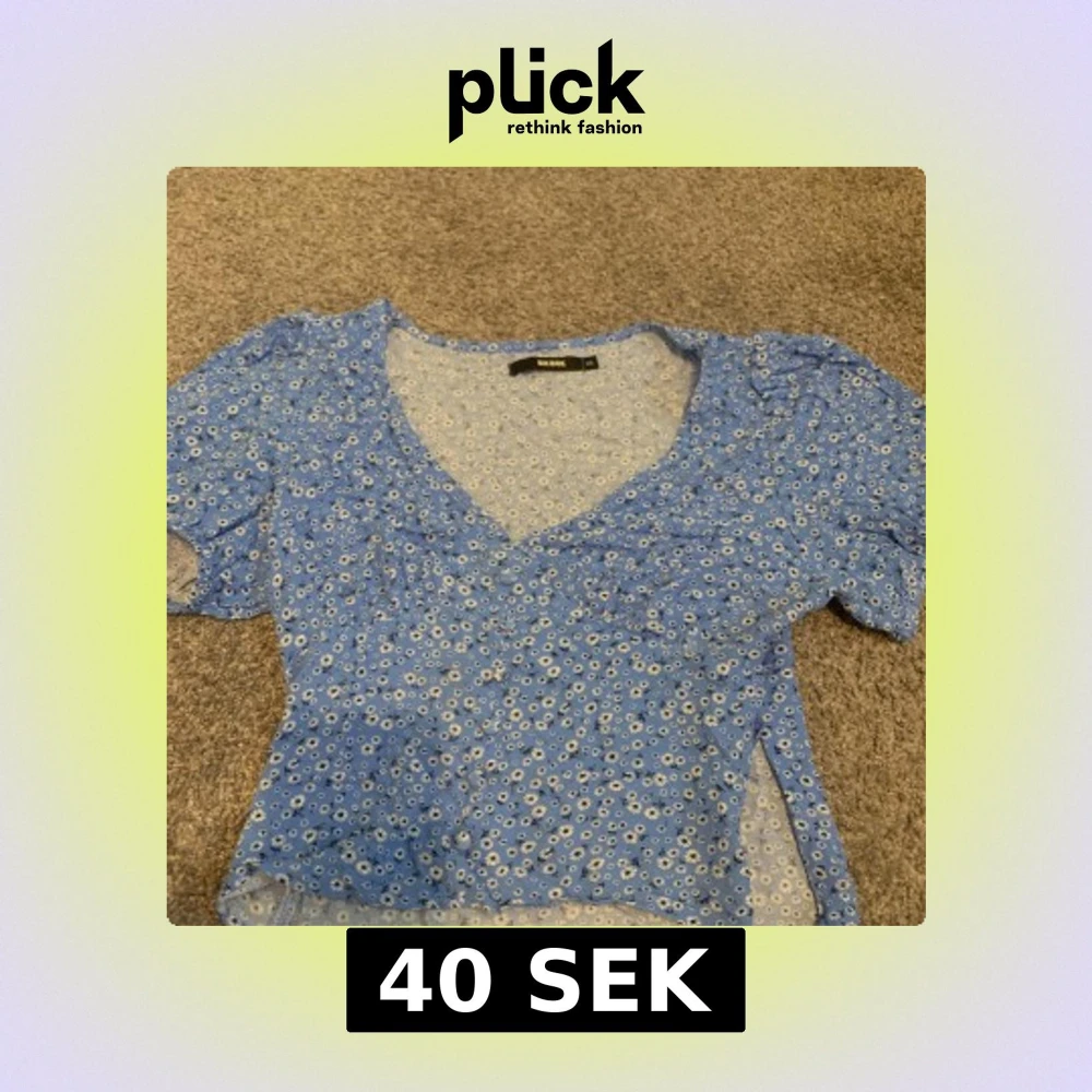 Supersöt blommig blus från BikBok i blått med små vita blommor. Modellen har v-ringning, korta puffärmar och lätt figursydd passform. Perfekt för dig som gillar romantisk och trendig stil.