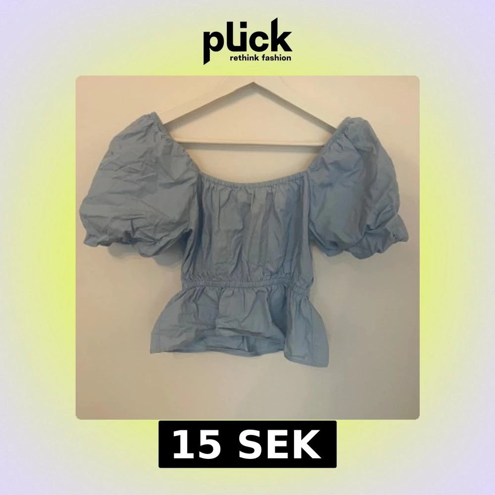 Superfin ljusblå blus med bred resår vid axlarna och stora puffärmar. Modellen är croppad med volang nedtill och har en luftig känsla, perfekt för varma dagar. Passar dig som gillar romantisk och trendig stil.från bikbok. Strl xs. Går att pruta