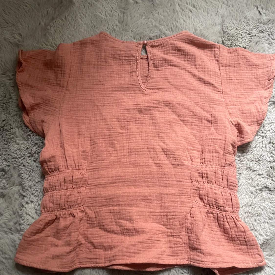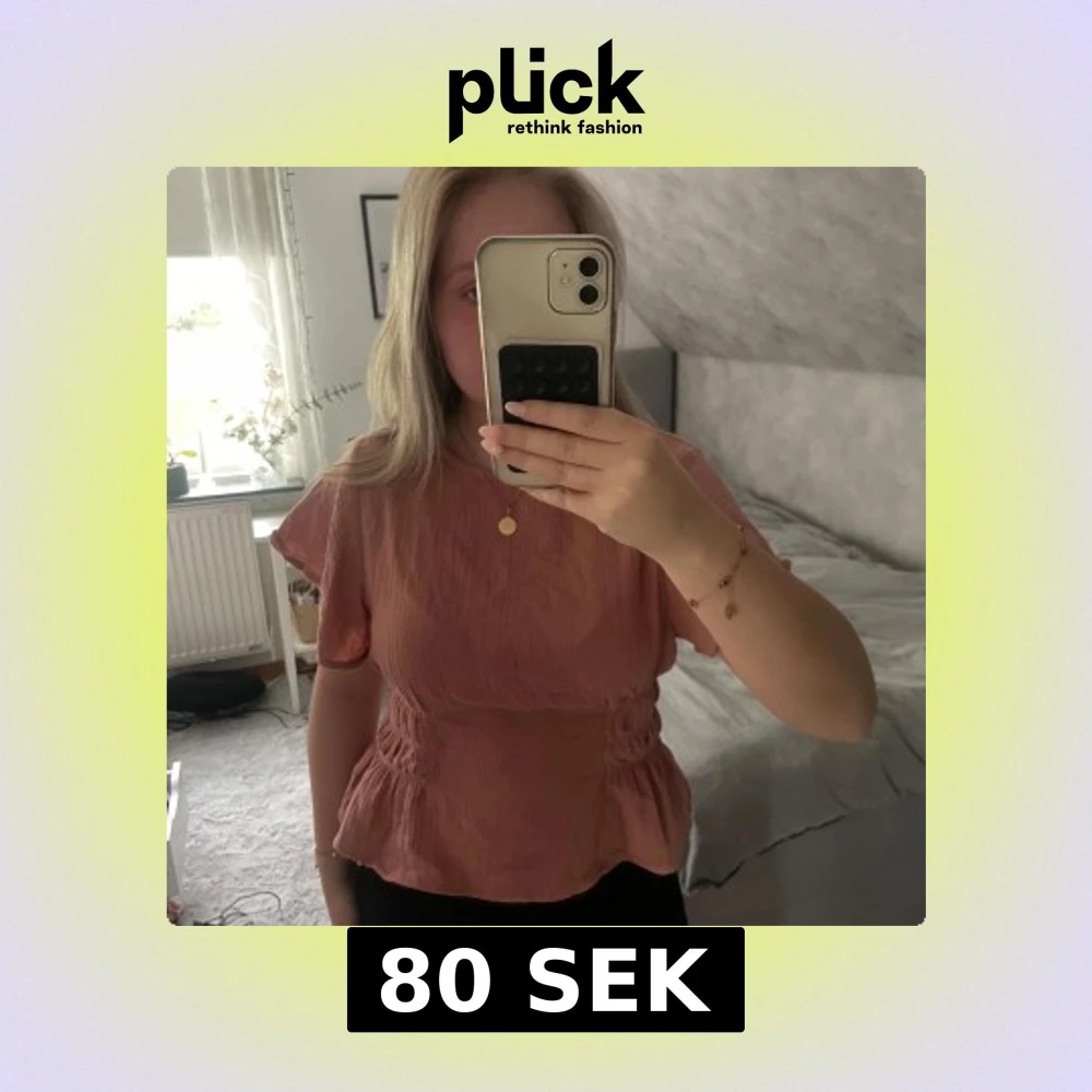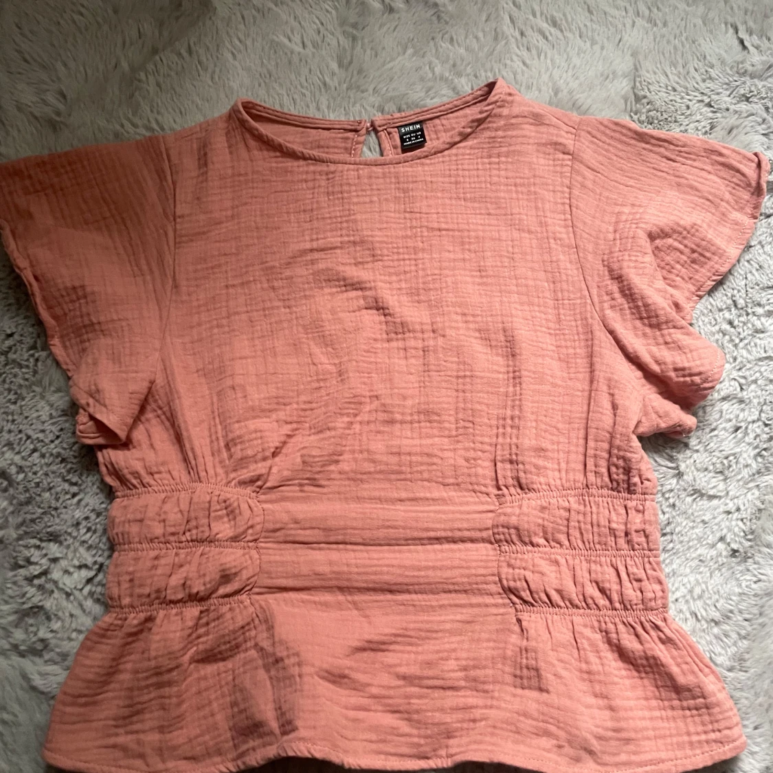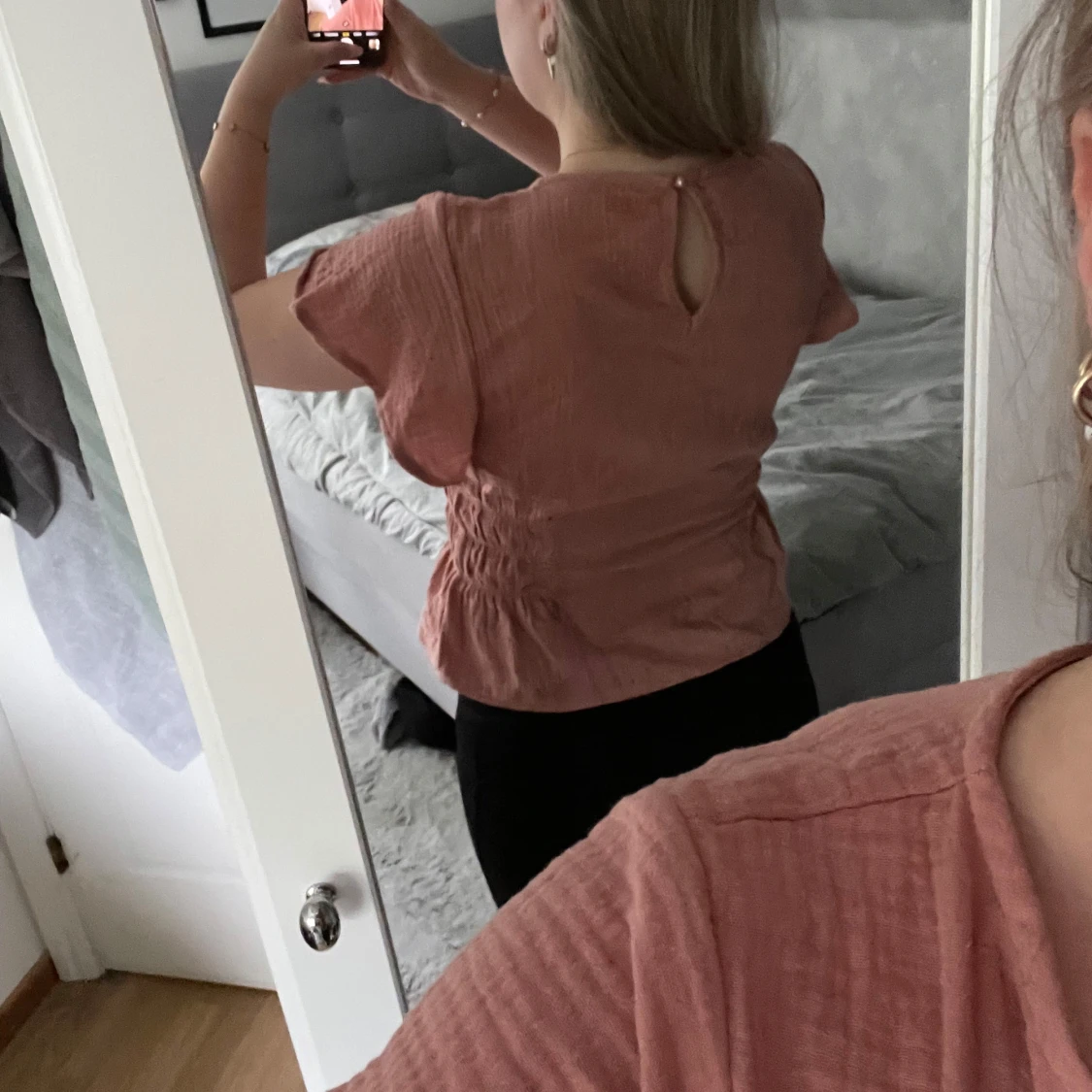 Superfin korall blus med korta volangärmar och smockdetaljer i midjan. Blusen har en lätt rynkad struktur och knäppning bak i nacken. Perfekt till jeans eller kjol för en söt och trendig look.