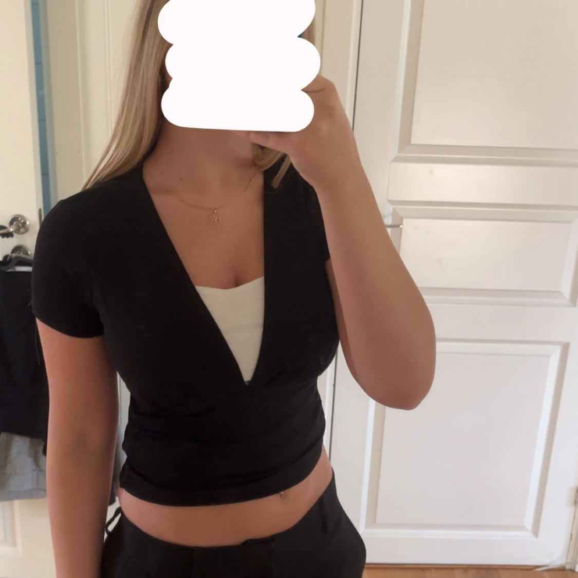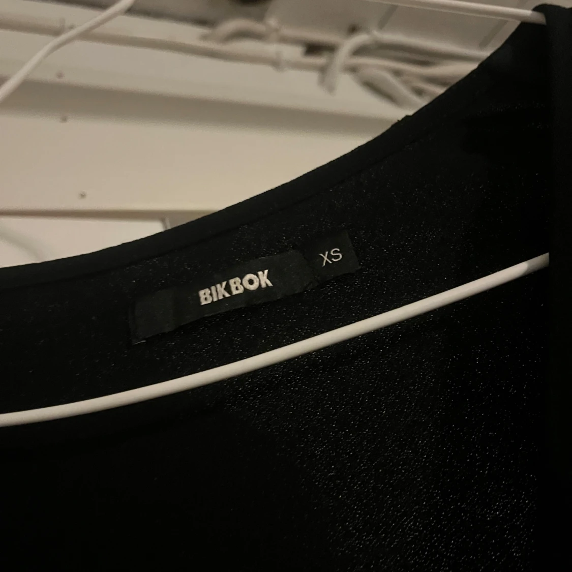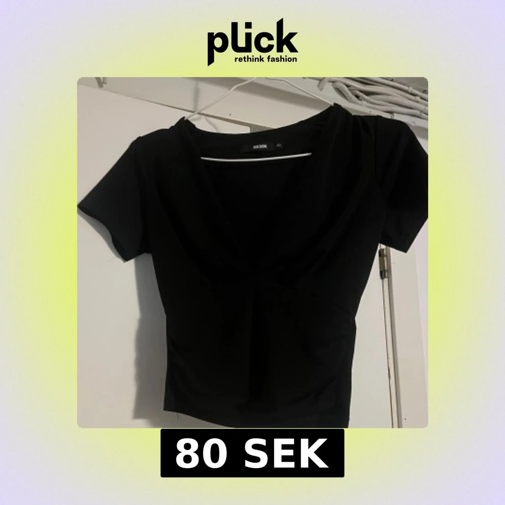 Svart kortärmad topp från BikBok i storlek XS. Toppen har en snygg v-ringning och figurnära passform som framhäver siluetten. Perfekt att matcha med jeans eller kjol för en stilren look.
