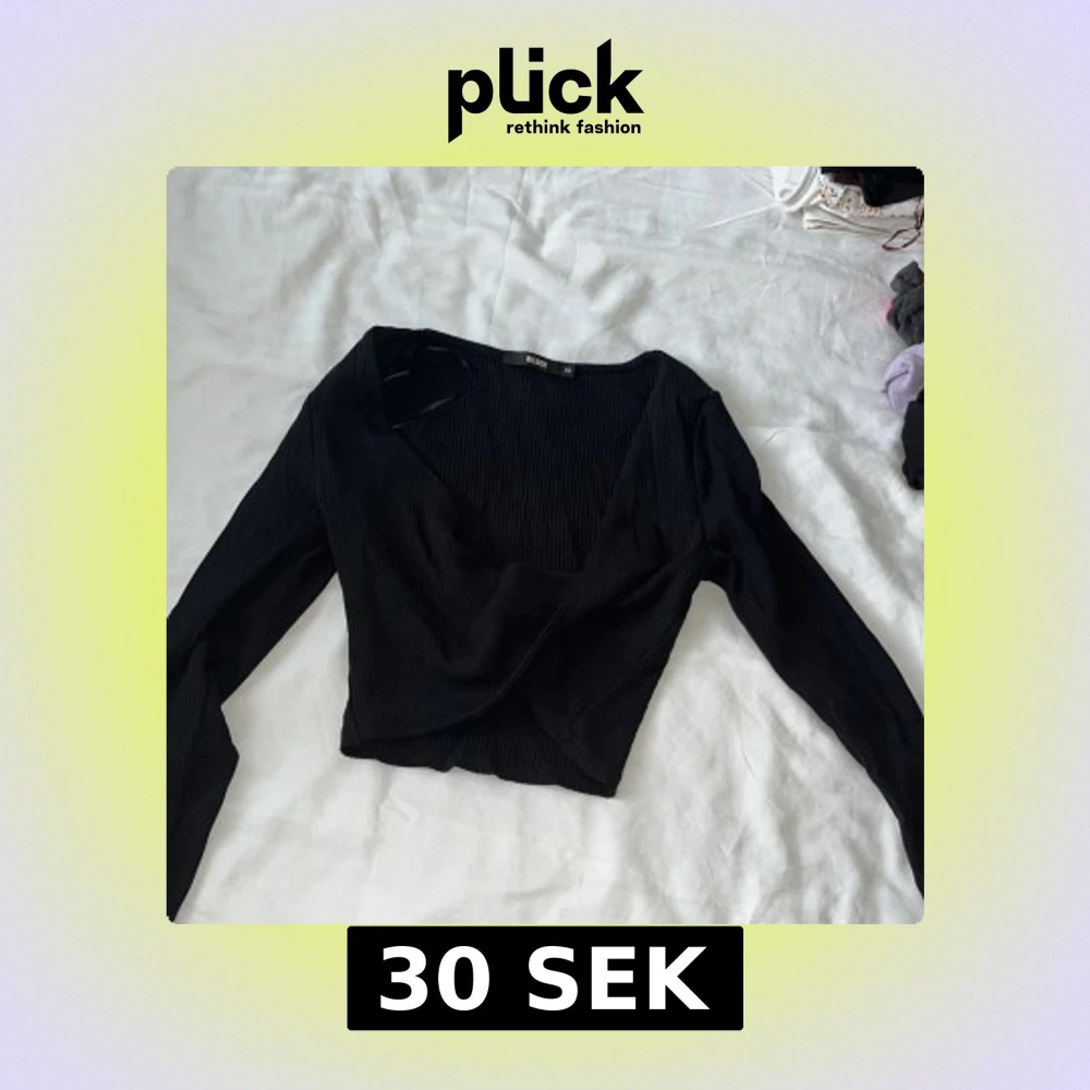 Säljer en svart ribbad omlottopp från Bik Bok i storlek XS. Toppen har lång ärm, croppad passform och djup v-ringning. Perfekt för dig som gillar stilrena och trendiga plagg med lite edge.
