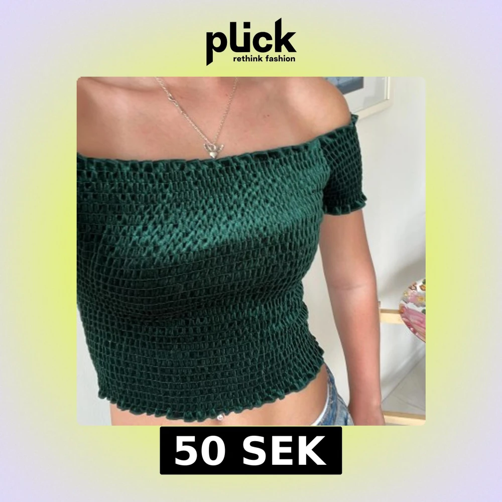 Supersnygg mörkgrön smockad topp med offshoulder och korta ärmar. I skimrig sammet. Perfekt att styla med jeans eller kjol för en trendig look.