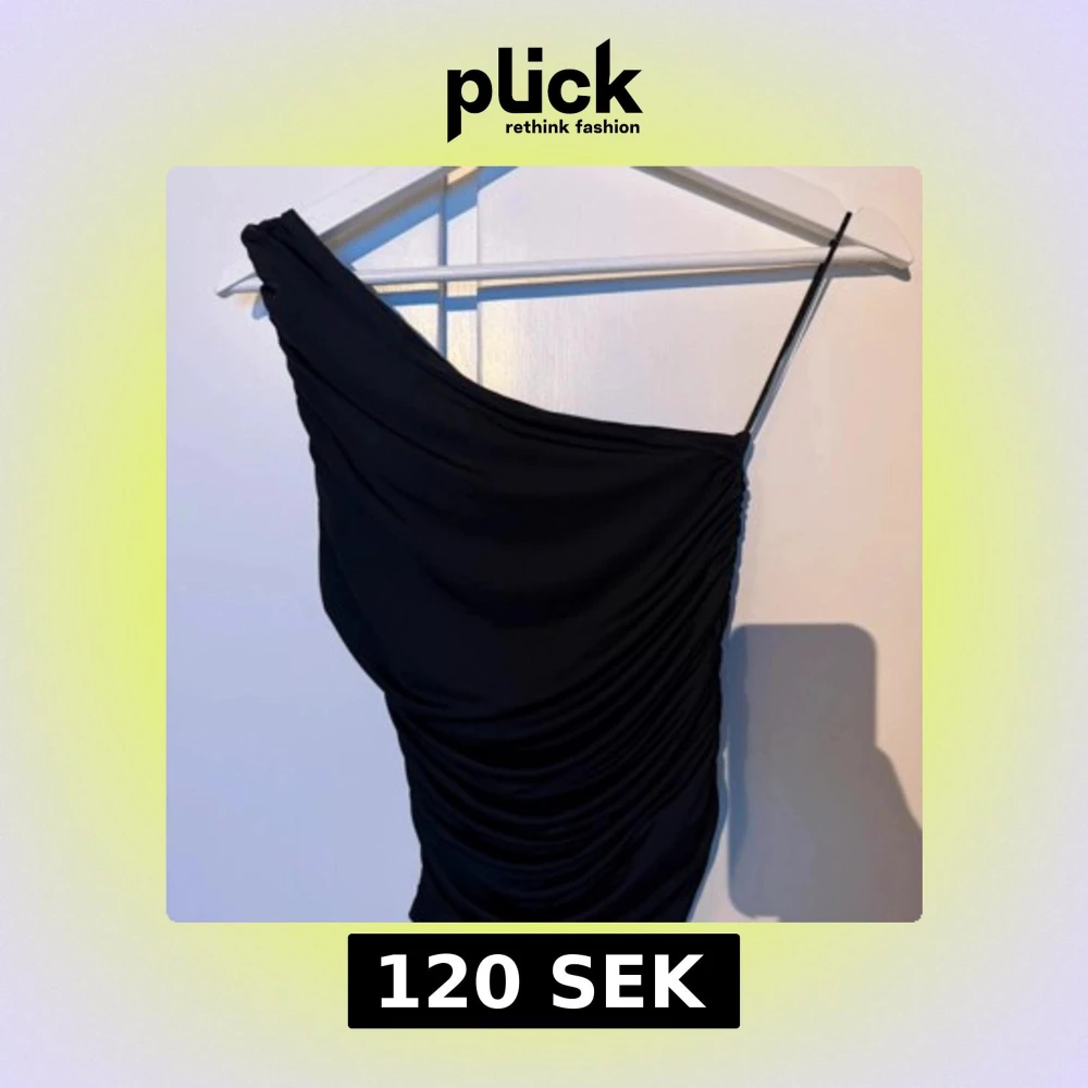 Snygg svart topp från BikBok i storlek XS. Toppen är one shoulder med en smal axelrem och draperad effekt längs hela plagget. Pris kan diskuteras!
