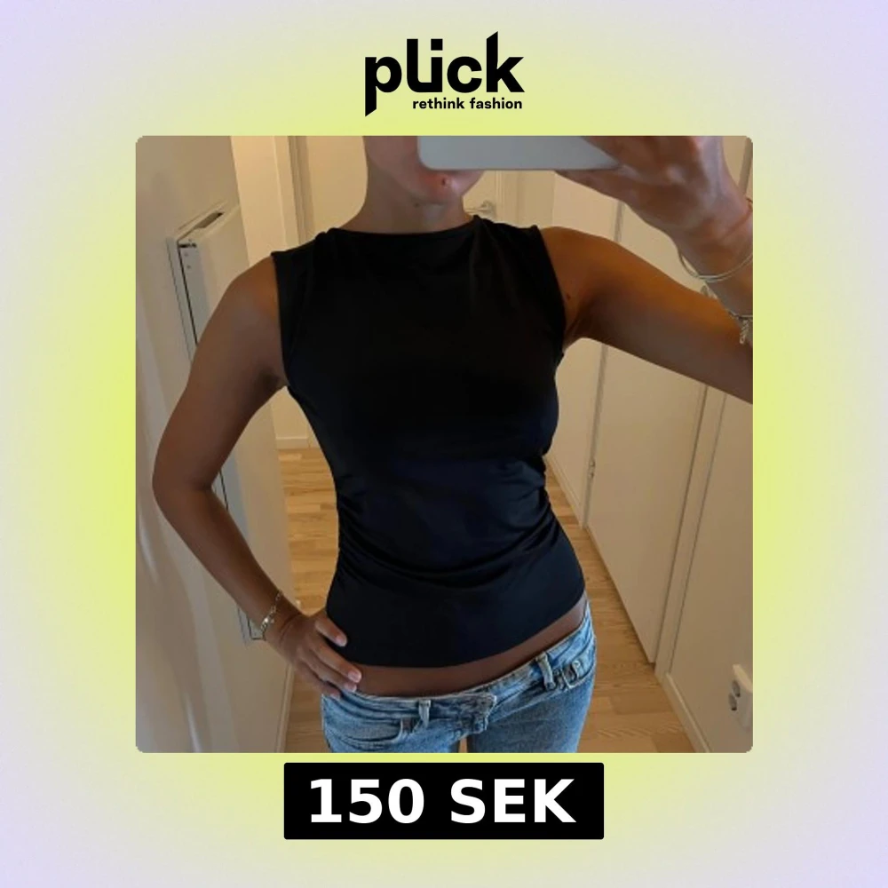Säljer en svart, tight och ärmlös topp med snygg öppen rygg och knytband i nacken. Toppen har en stilren, enkel framsida och är tillverkad i ett stretchigt, mjukt material som sitter skönt mot kroppen.