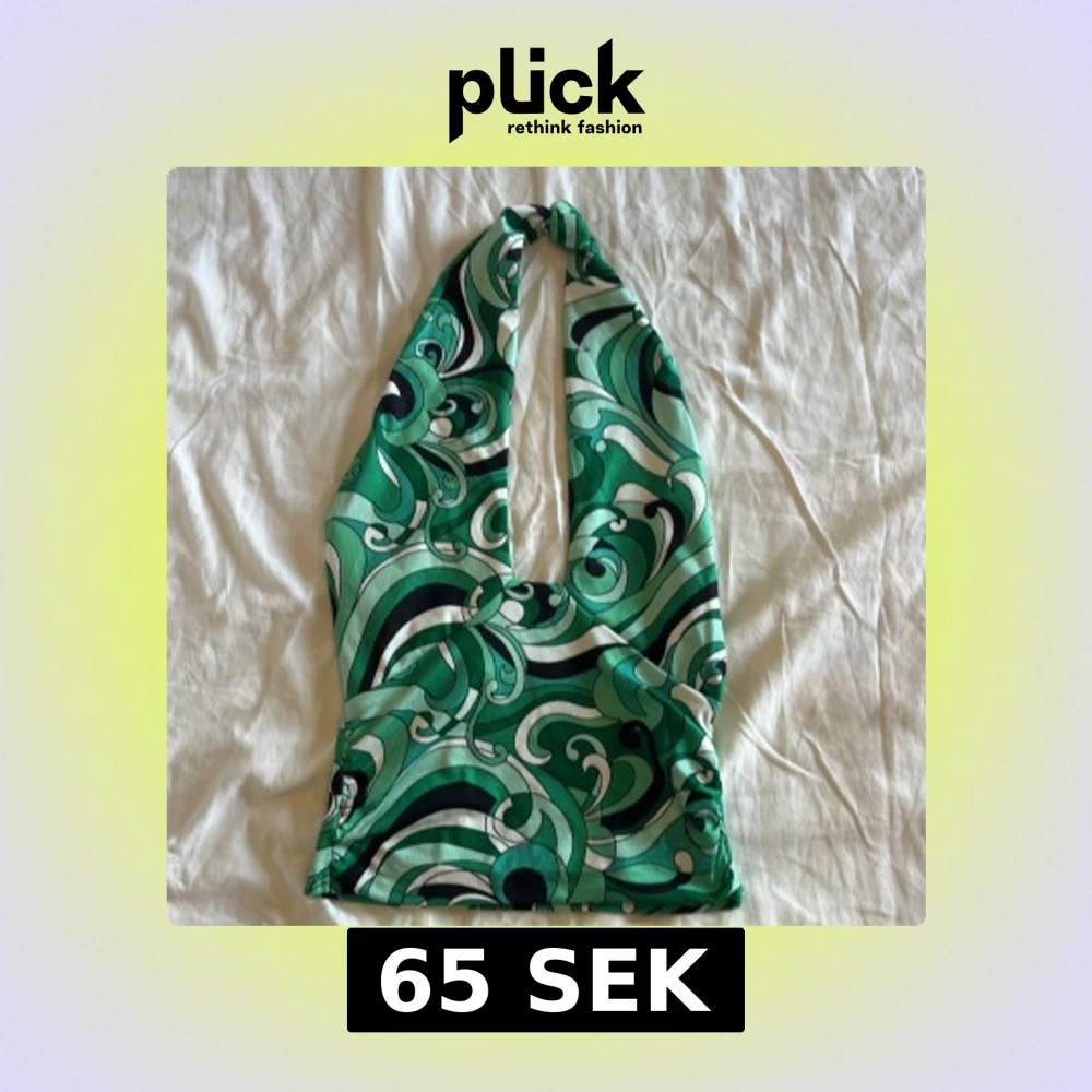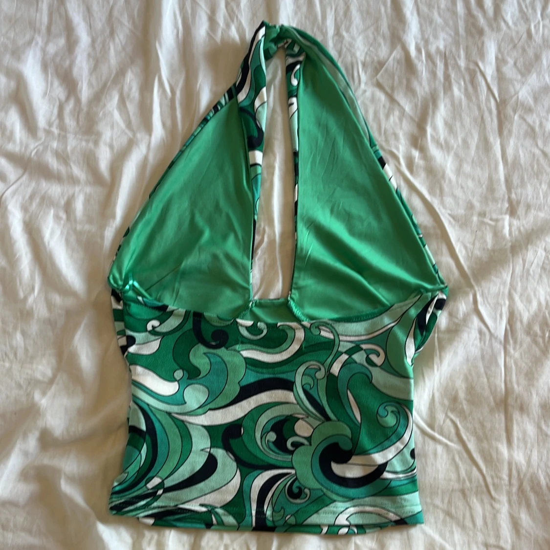 Säljer en snygg halterneck topp med grönt, svart och vitt swirlmönster. Toppen har djup urringning och knyts i nacken, vilket ger en cool och trendig look. Perfekt för dig som gillar färg och vill sticka ut lite extra.
