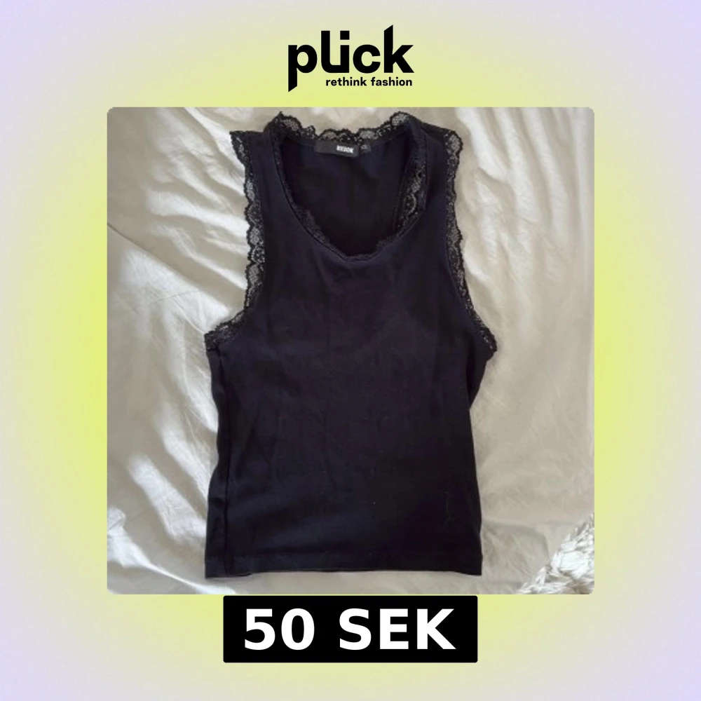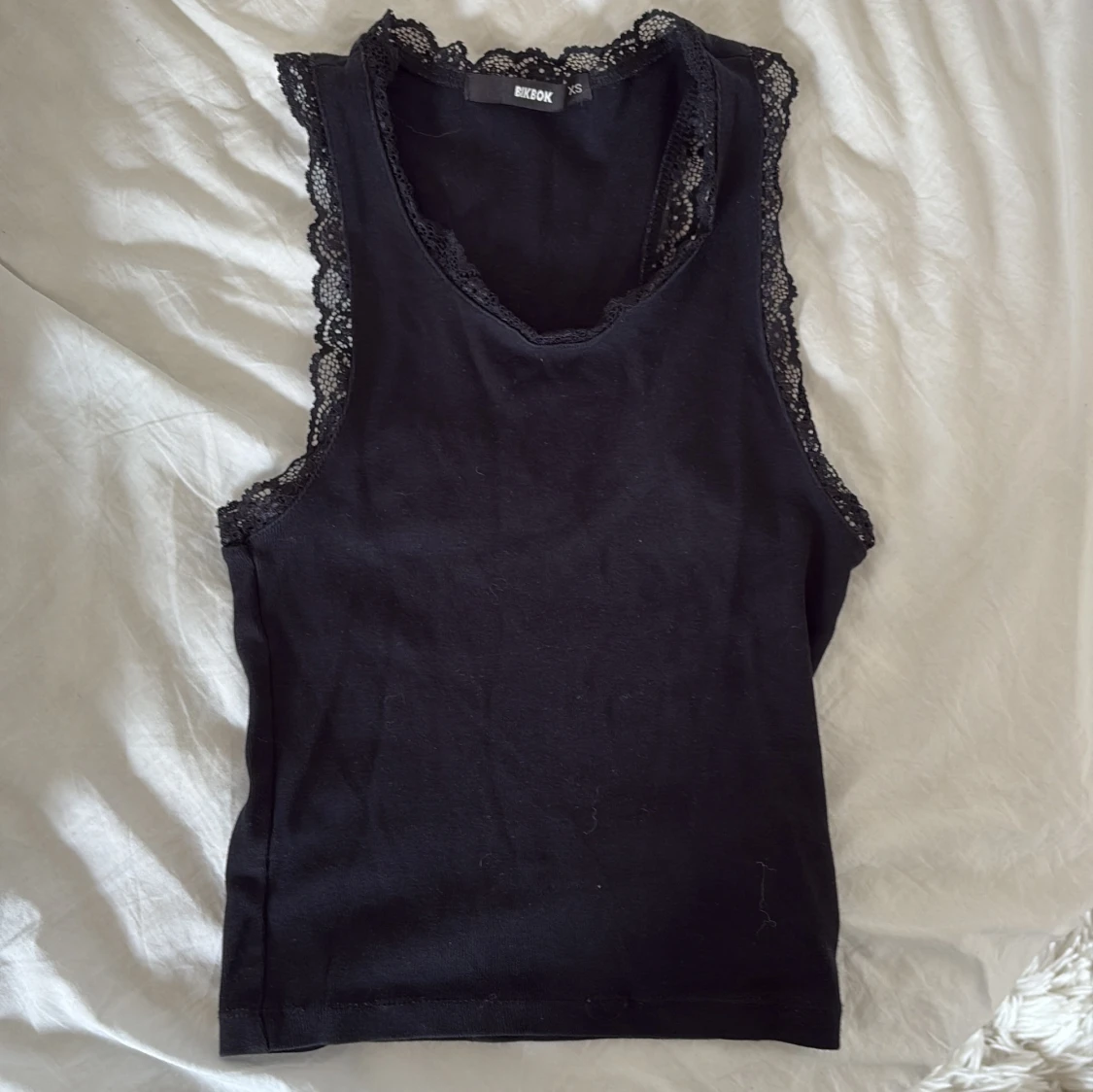 Svart ärmlös linnetopp från Bik Bok med fina spetsdetaljer längs halsringning och ärmhål. Toppens enkla design gör den lätt att matcha och den har en mjuk bomullskänsla. Perfekt för att skapa en stilren look.