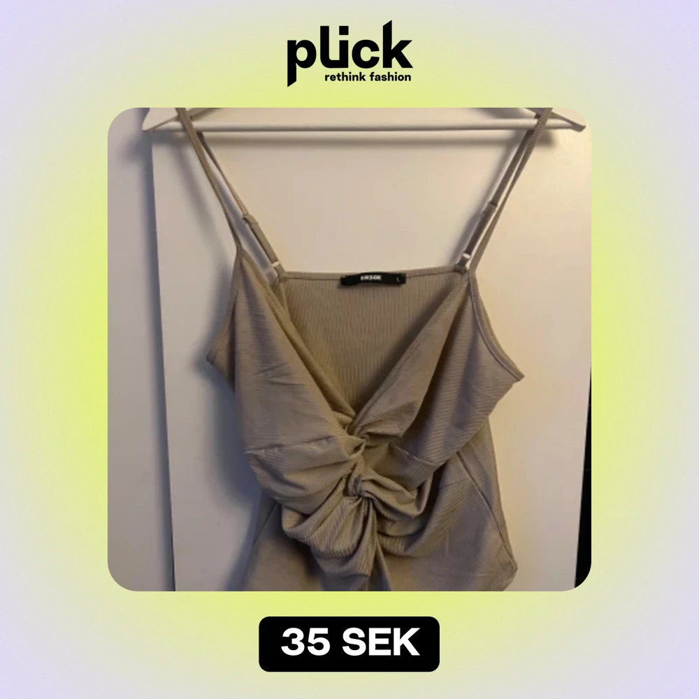 Ett beige linne från BikBok med justerbara axelband och en knutdetalj framtill. Linnet har en ribbad textur och är ärmlöst.