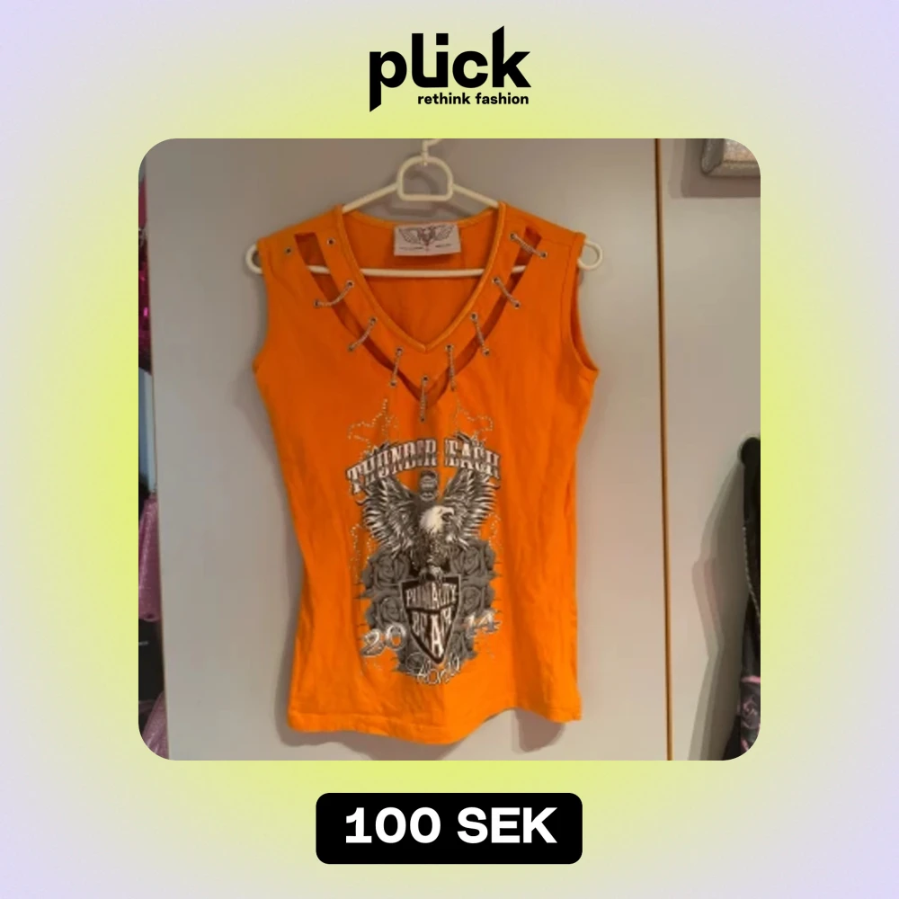 Cool topp med tryck och strass! Köpt second hand men aldrig använd. Saknar en kedja. Står ej storlek men skulle säga M (jag är L/XL och den sitter tight på mig)