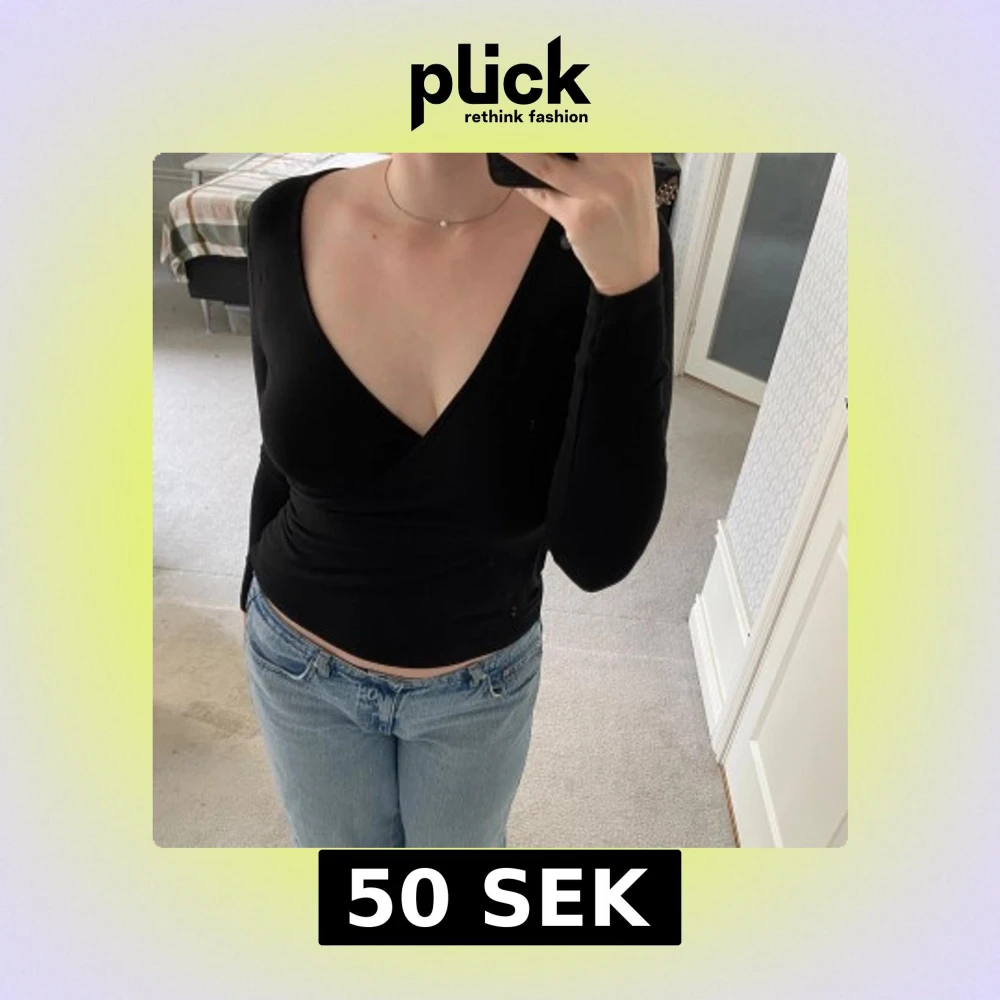 Svart långärmad, stretchig omlottopp från ASOS med djup v-ringning. Storlek Large /42 Använt fåtal gånger