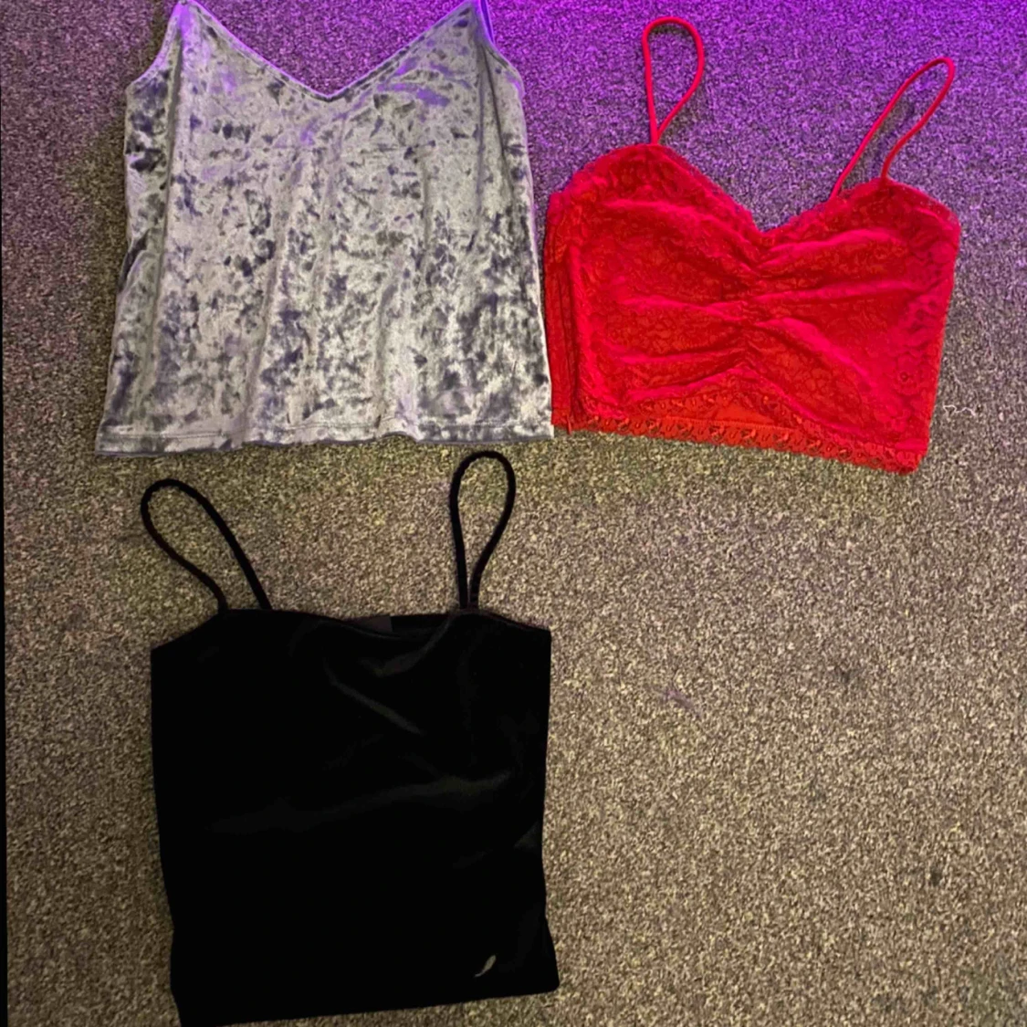 Ett svart linne i plysch, gråblå linne också i plysch och ett rött linne i spets, köp allihop för 50kr dom är aldrig använda och kommer nog inte andvända dom så vill bara bli av med dom. Hör av dig om du är intresserad