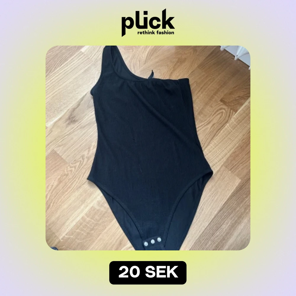 En svart ribbad oneshoulder bodysuit med knappar i grenen. Bodysuiten har en asymmetrisk design med en axelbandslös sida.