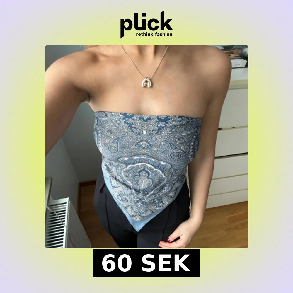 Snygg blå tubtopp med paisleymönster och knytning i ryggen. Perfekt för sommardagar och festivaler. Toppen är axelbandslös och ger en trendig look. Det är en ”sjal” som kan kan knyta som en scraf eller hur man vill!