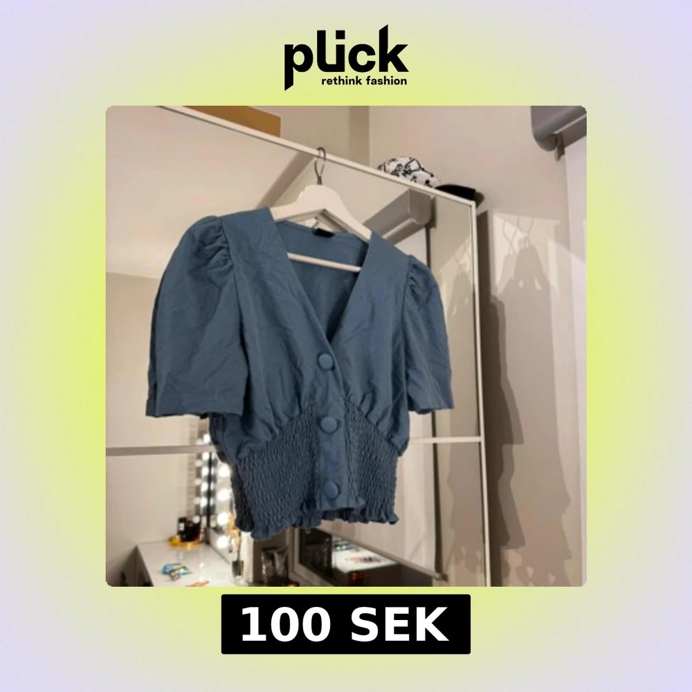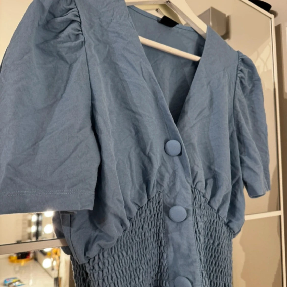 Charmig blå blus med korta ärmar och stora knappar framtill. Blusen har en smockad nederdel som ger en fin passform och volym vid axlarna för en trendig look.