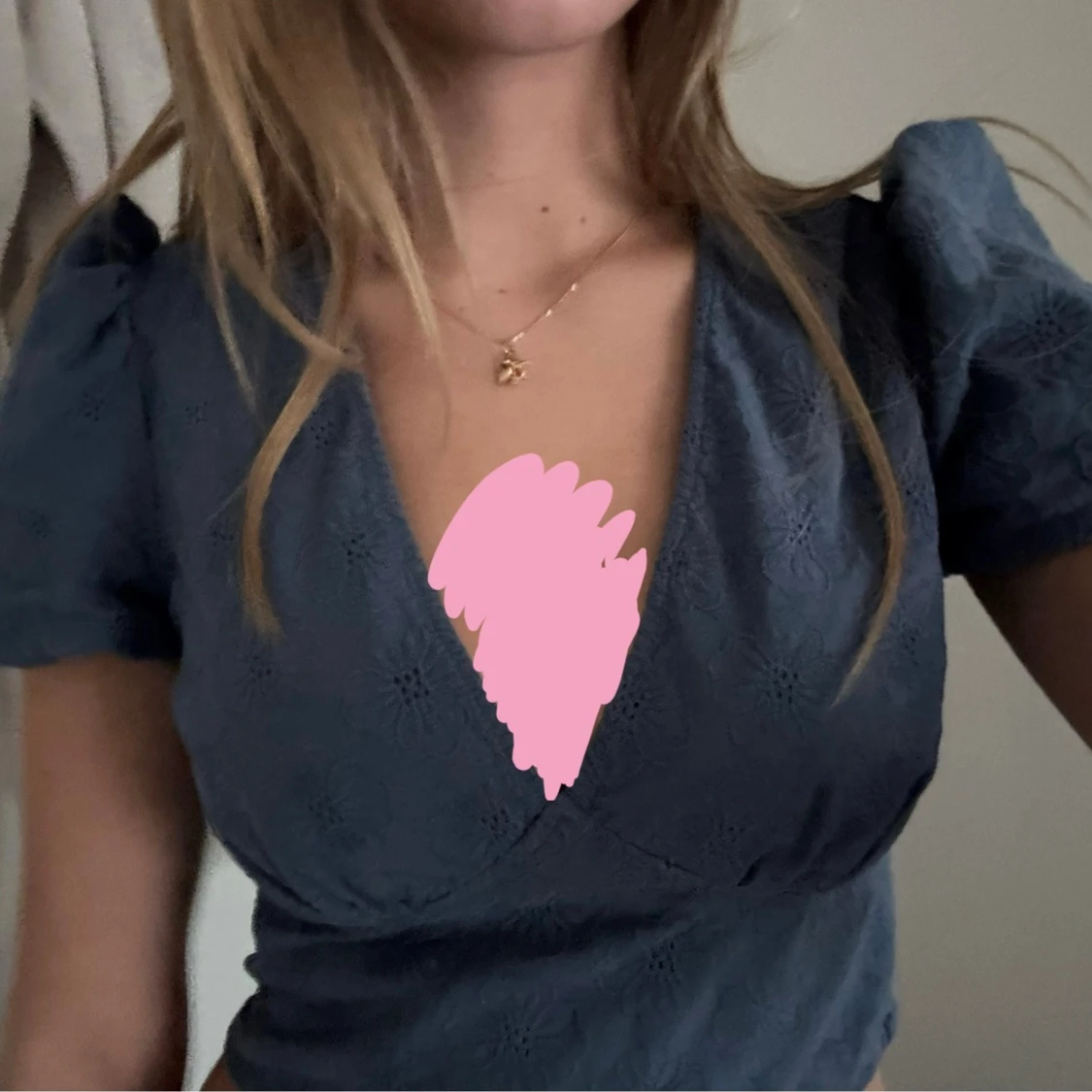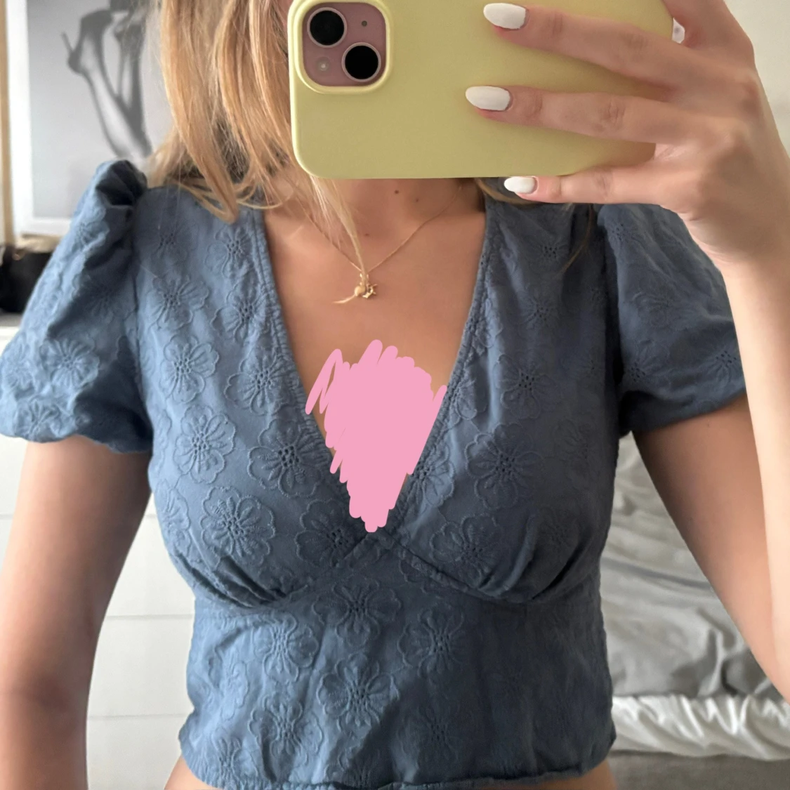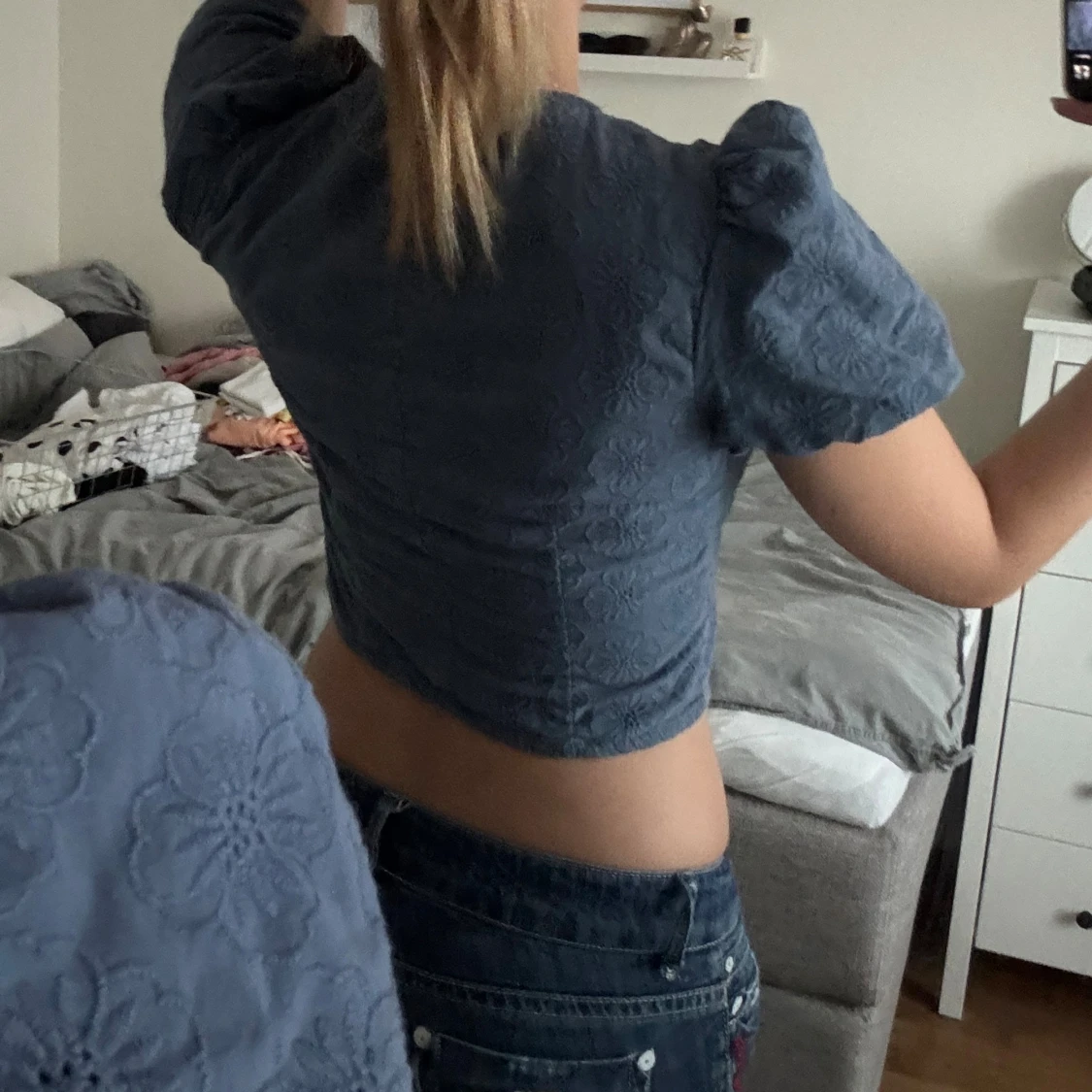 Supersöt blå blus från NA-KD med broderade blommor, v-ringning och korta puffärmar. Croppad modell som ger en trendig look. Perfekt till jeans eller kjol för en fräsch stil.