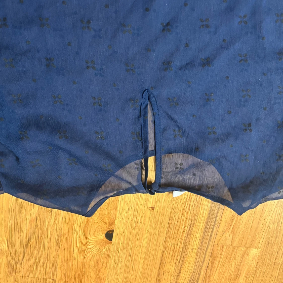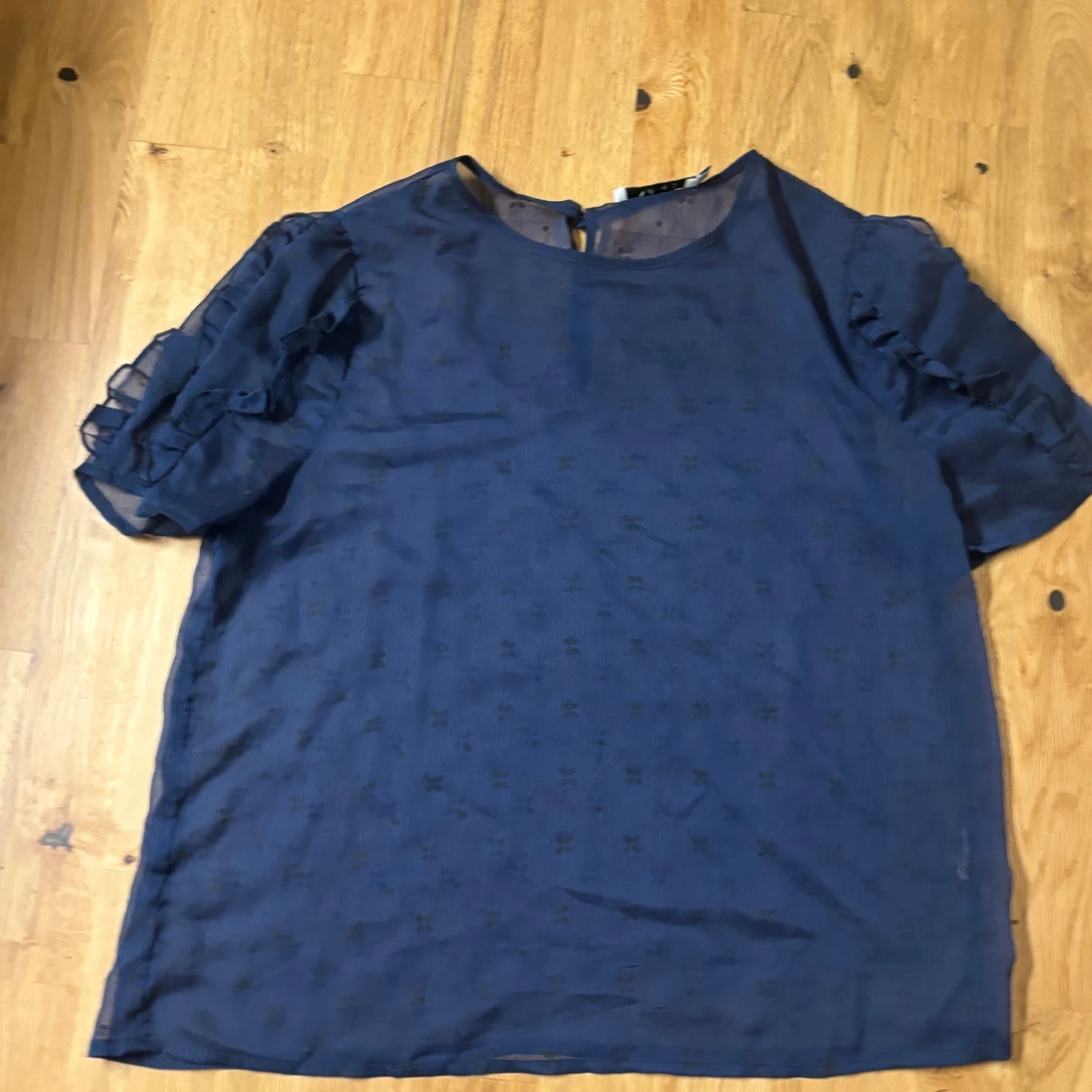 Säljer en blå blus från NA-KD i storlek 38. Blusen har korta volangärmar, diskret blommönster och en liten knappdetalj bak. Tunt, lätt material som ger en luftig känsla. Perfekt för dig som gillar feminina detaljer och stilren look. Väldigt genomskinlig men sitter fint med ett linne under eller som den är.