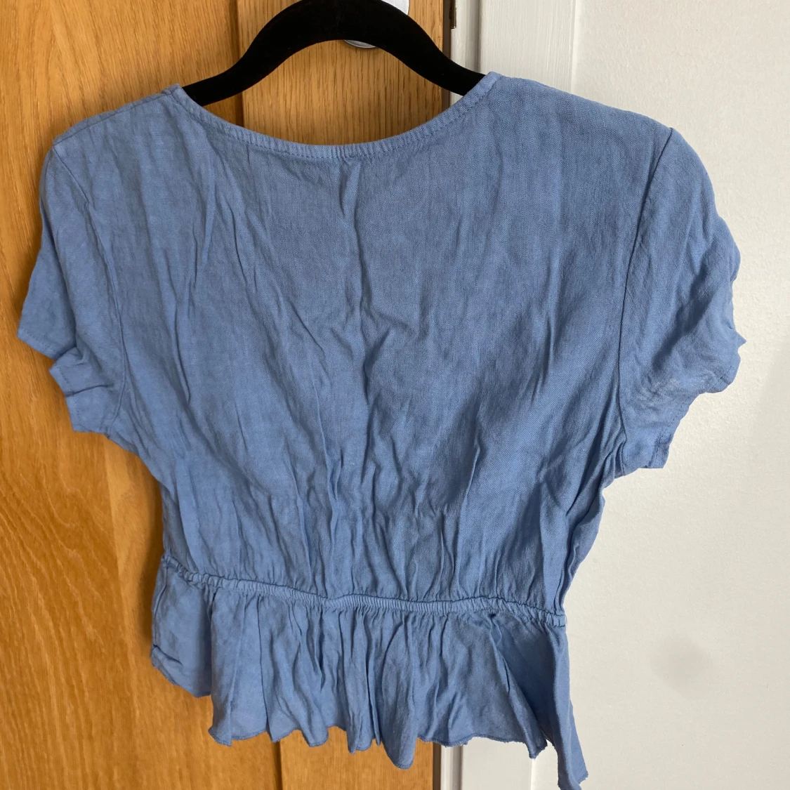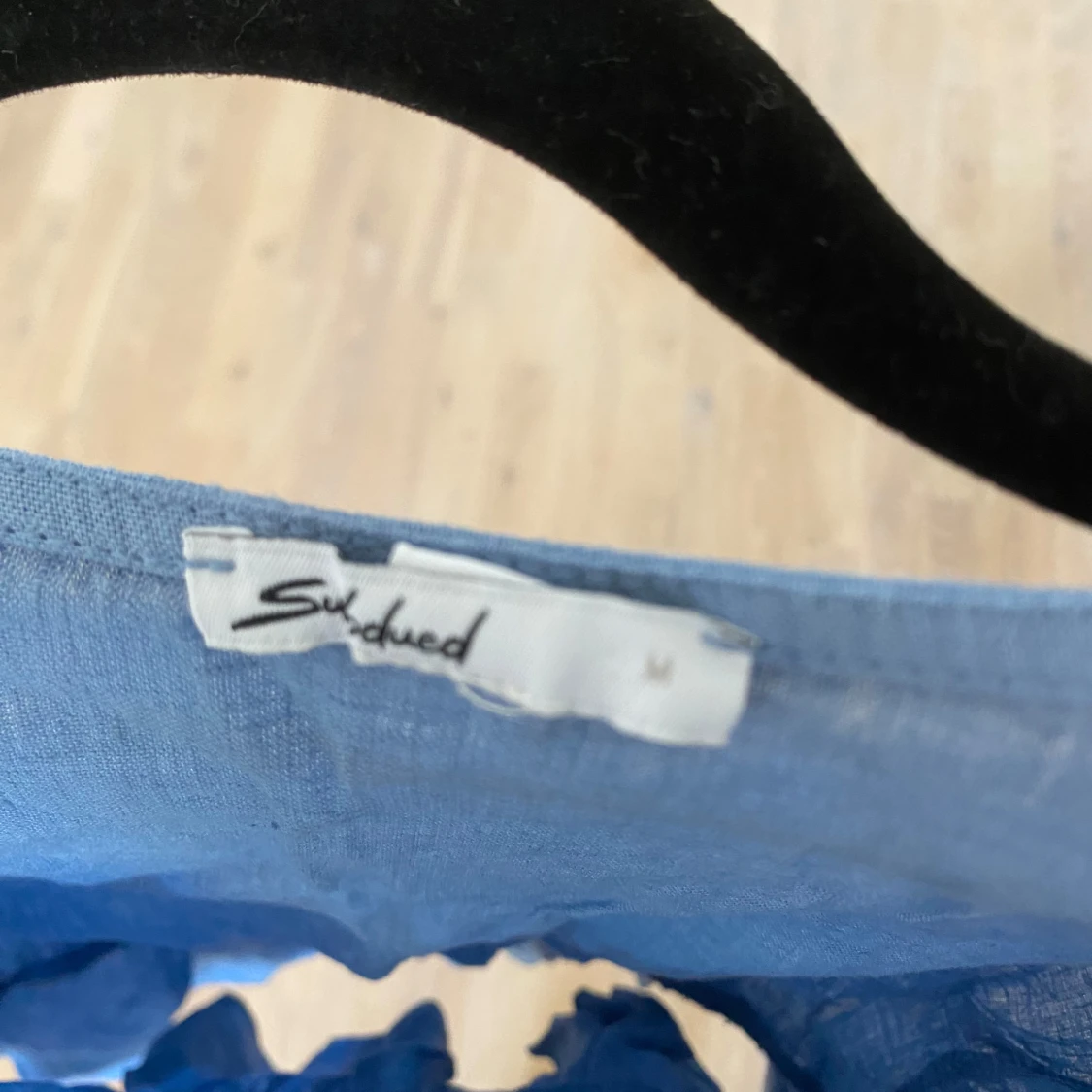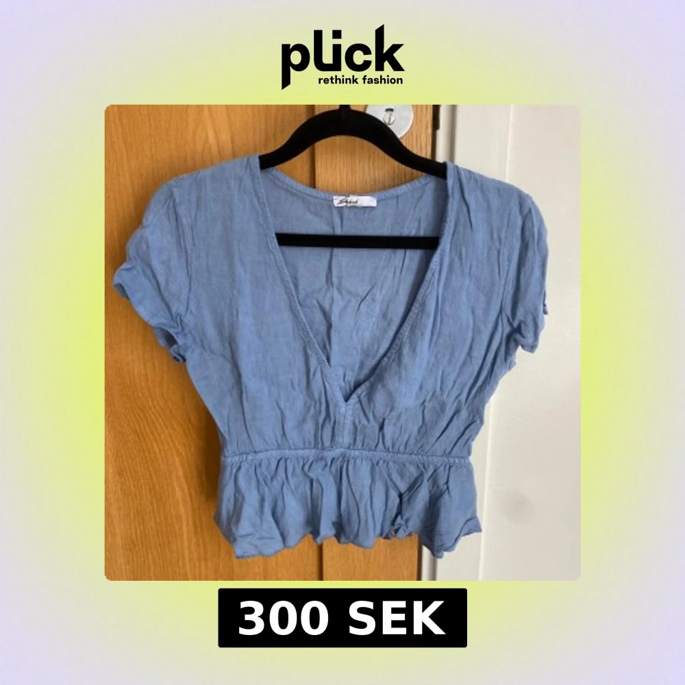 Säljer en ljusblå croppad linnetopp från Subdued med korta puffärmar och djup v-ringning. Toppen har volang nedtill och resår i midjan för en snygg passform. Perfekt för varma dagar!