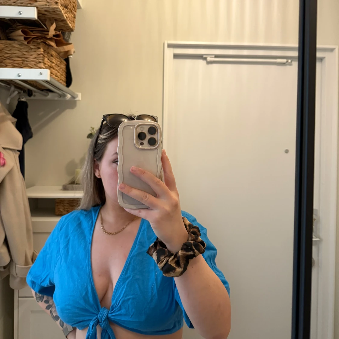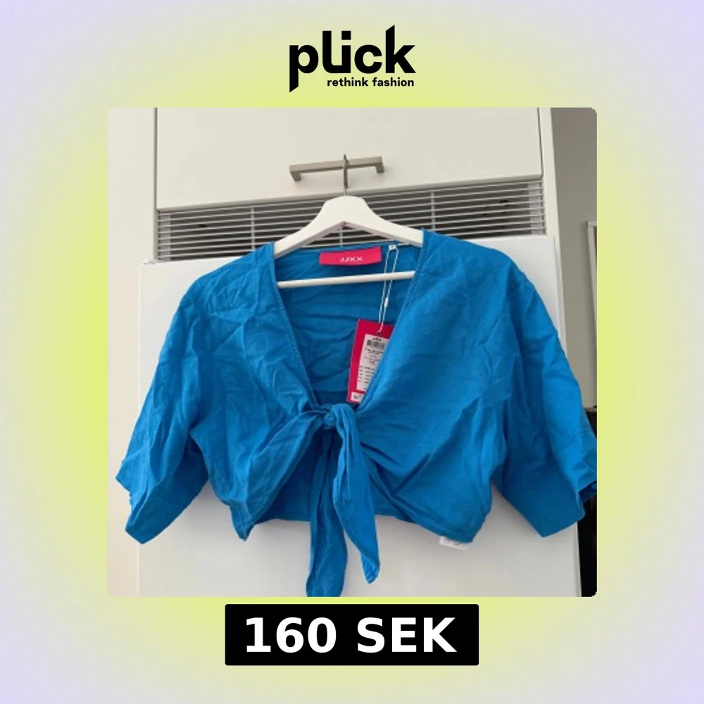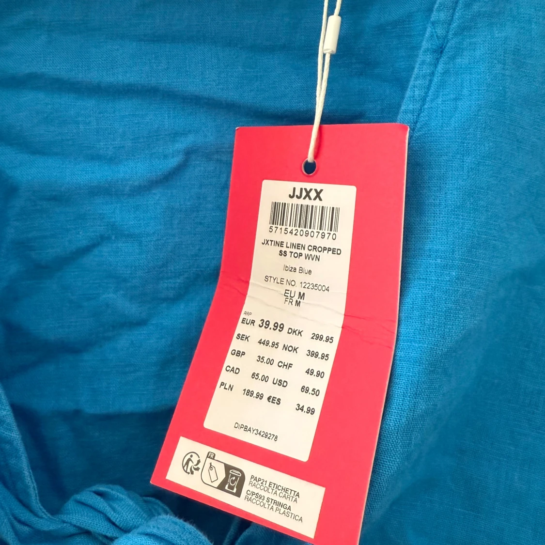 Säljer en snygg blå croppad linnetopp från JJXX. Toppen har en knytning framtill och trekvartsärmar, perfekt för en somrig look.