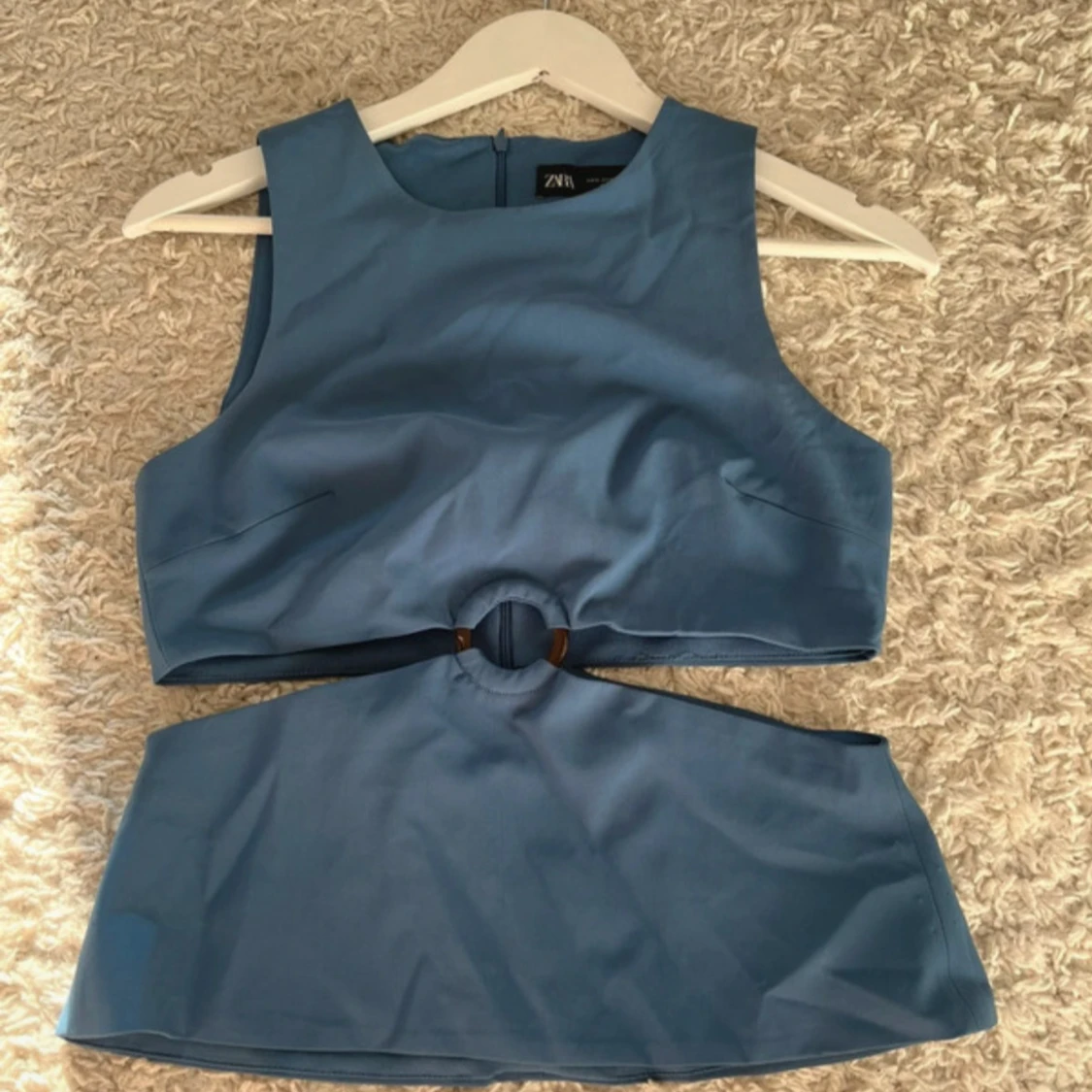 Säljer en trendig blå croppad topp från Zara med cut-out detalj med ring framtill. Supersnygg till både vardags och fest! Använd enstaka gång