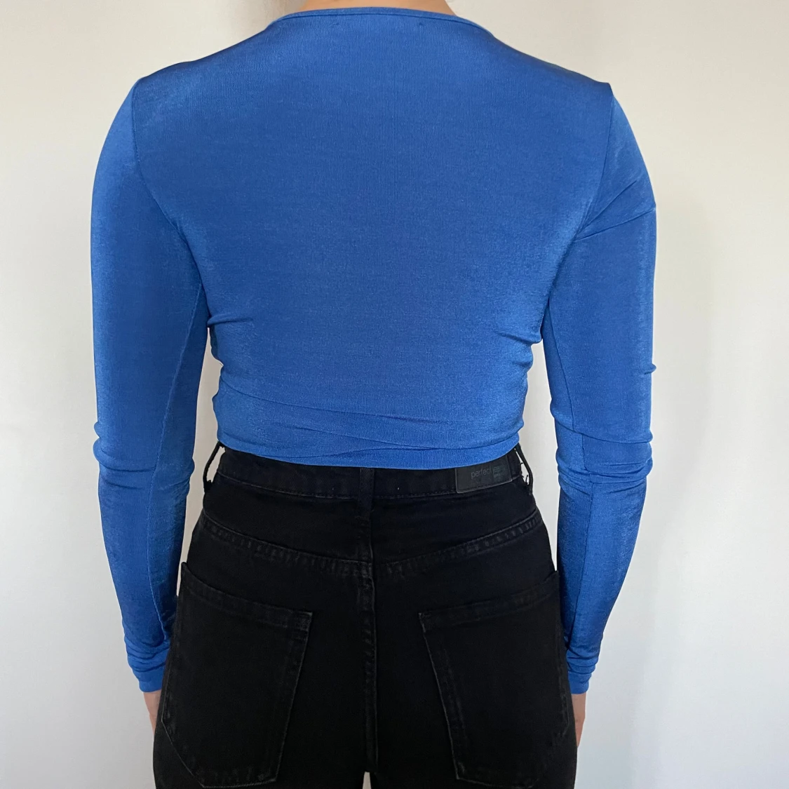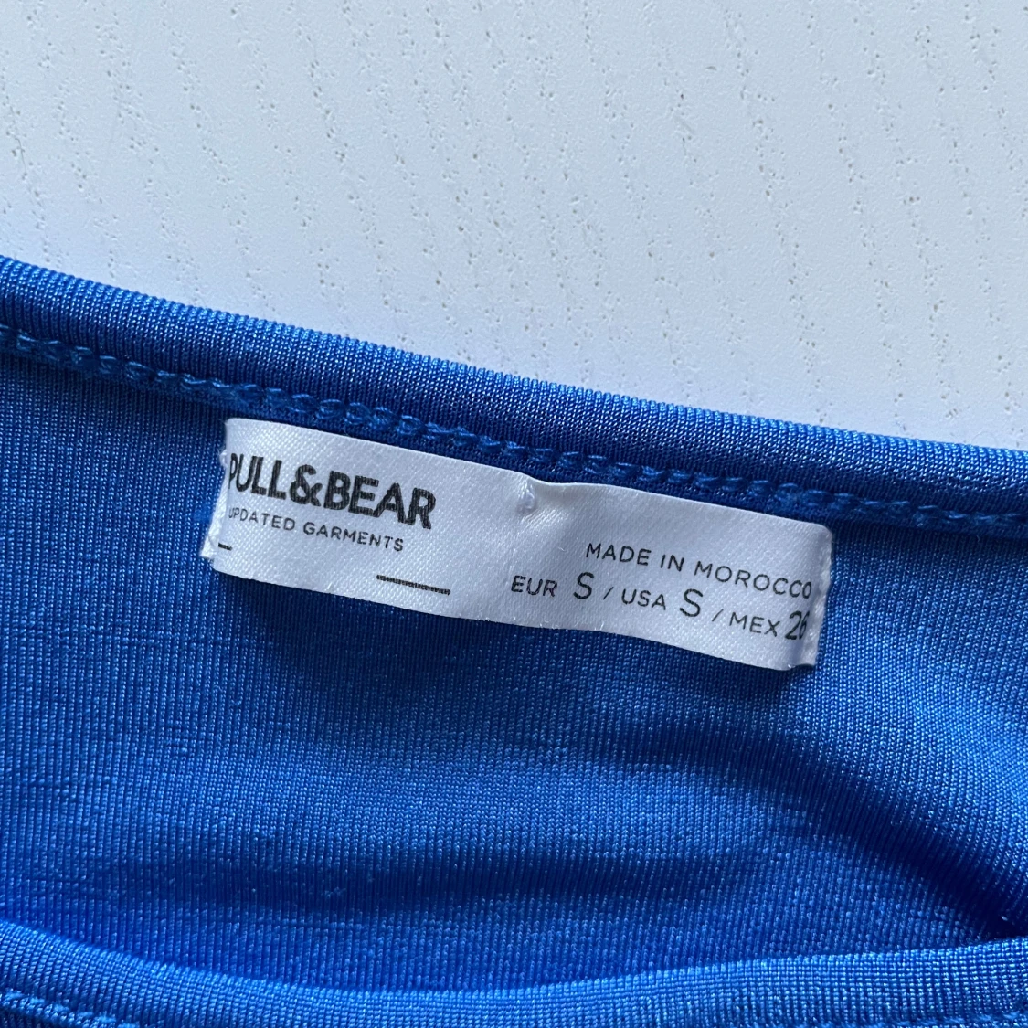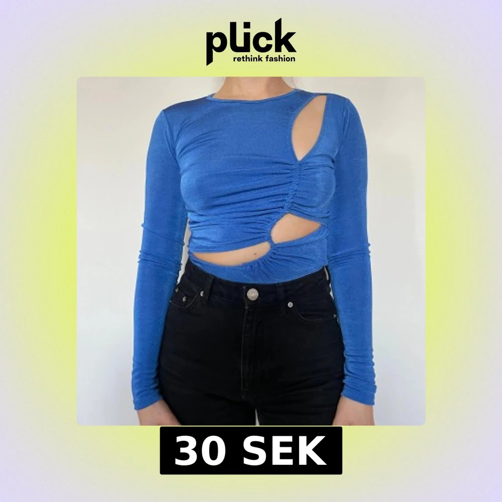 Säljer en blå långärmad topp från Pull&Bear med coola cut out-detaljer och rynkade partier framtill. Toppen är figurnära och har en unik design med asymmetriska öppningar. Perfekt för dig som vill sticka ut med din stil.