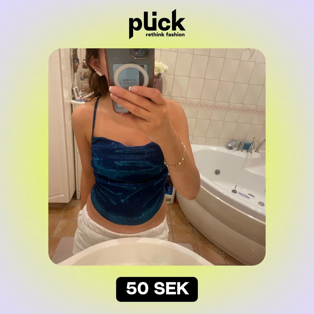 Snygg blå glittrig linnetopp med smala axelband och öppen rygg. Perfekt för festliga tillfällen! Toppen är croppad och har en glansig finish som verkligen sticker ut.