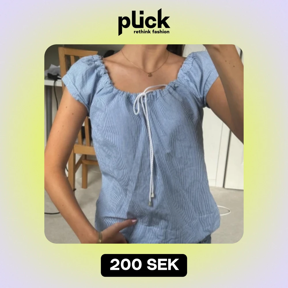 Säljer en superfin blå- och vitrandig topp med korta ärmar och en söt knytning framtill, toppen skick utan defekter!