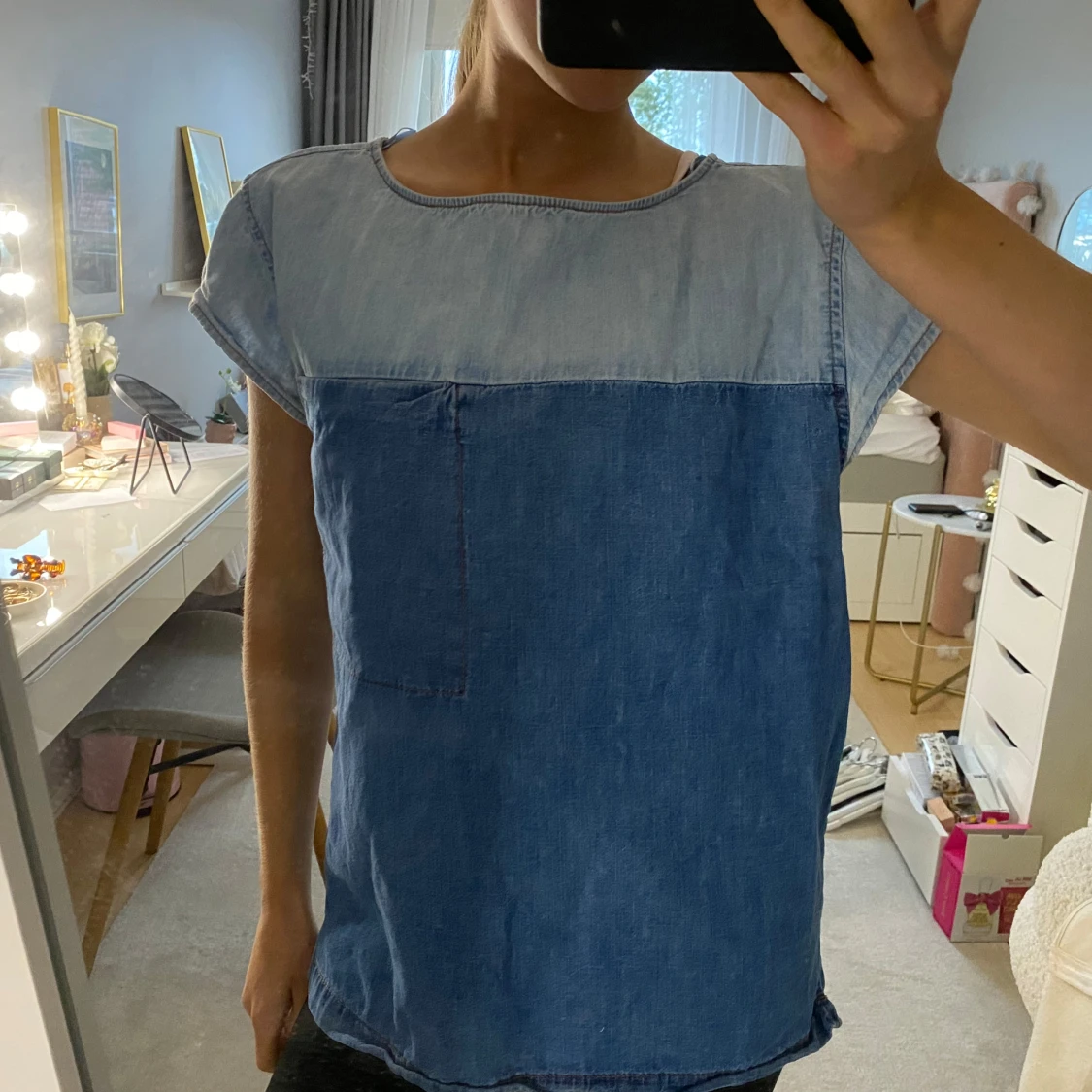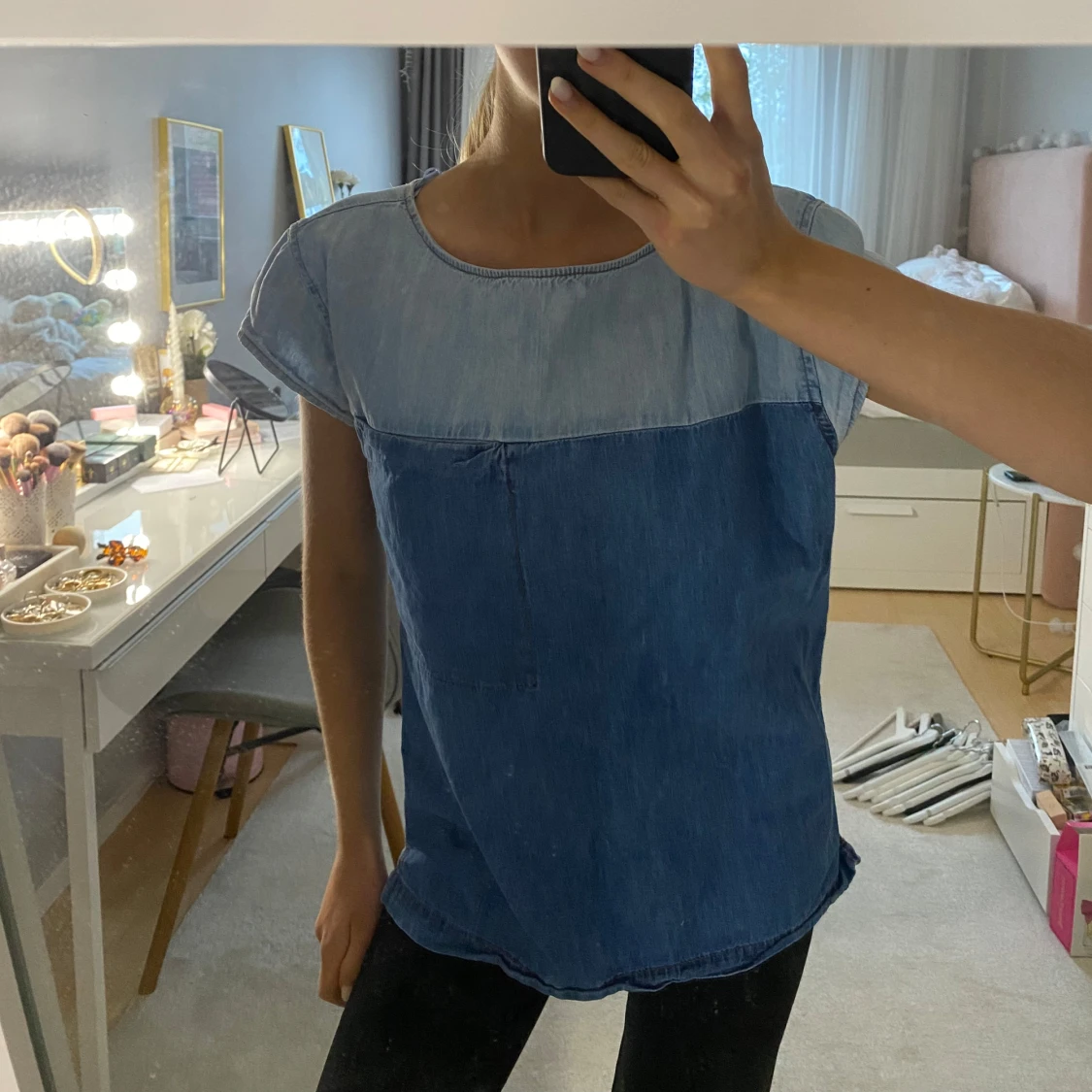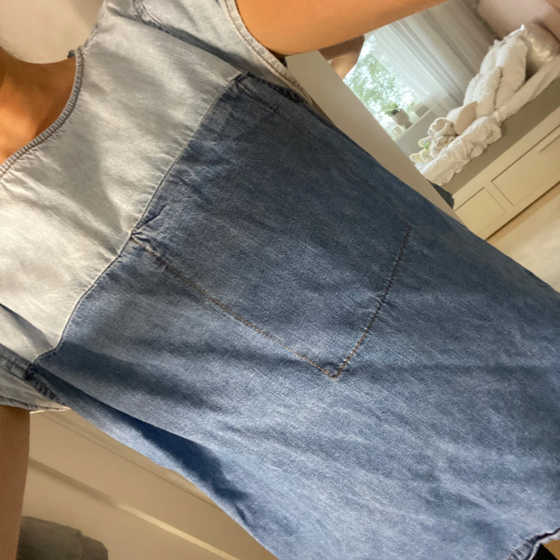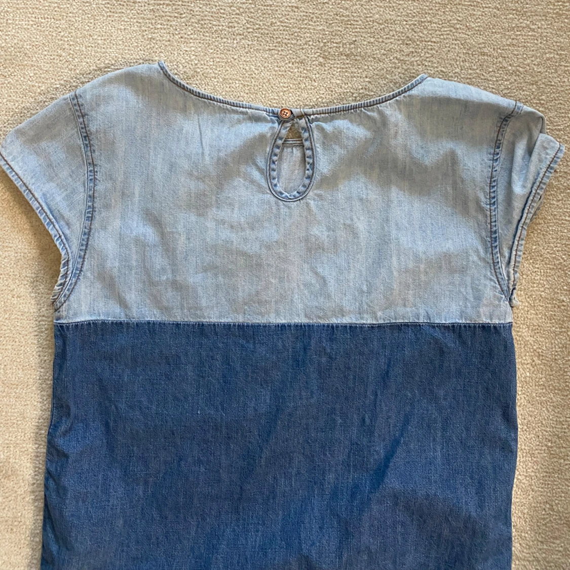 Säljer en snygg och unik blå jeans-topp med tvåfärgad design med ljusare jeans upptill och mörkare nedtill.