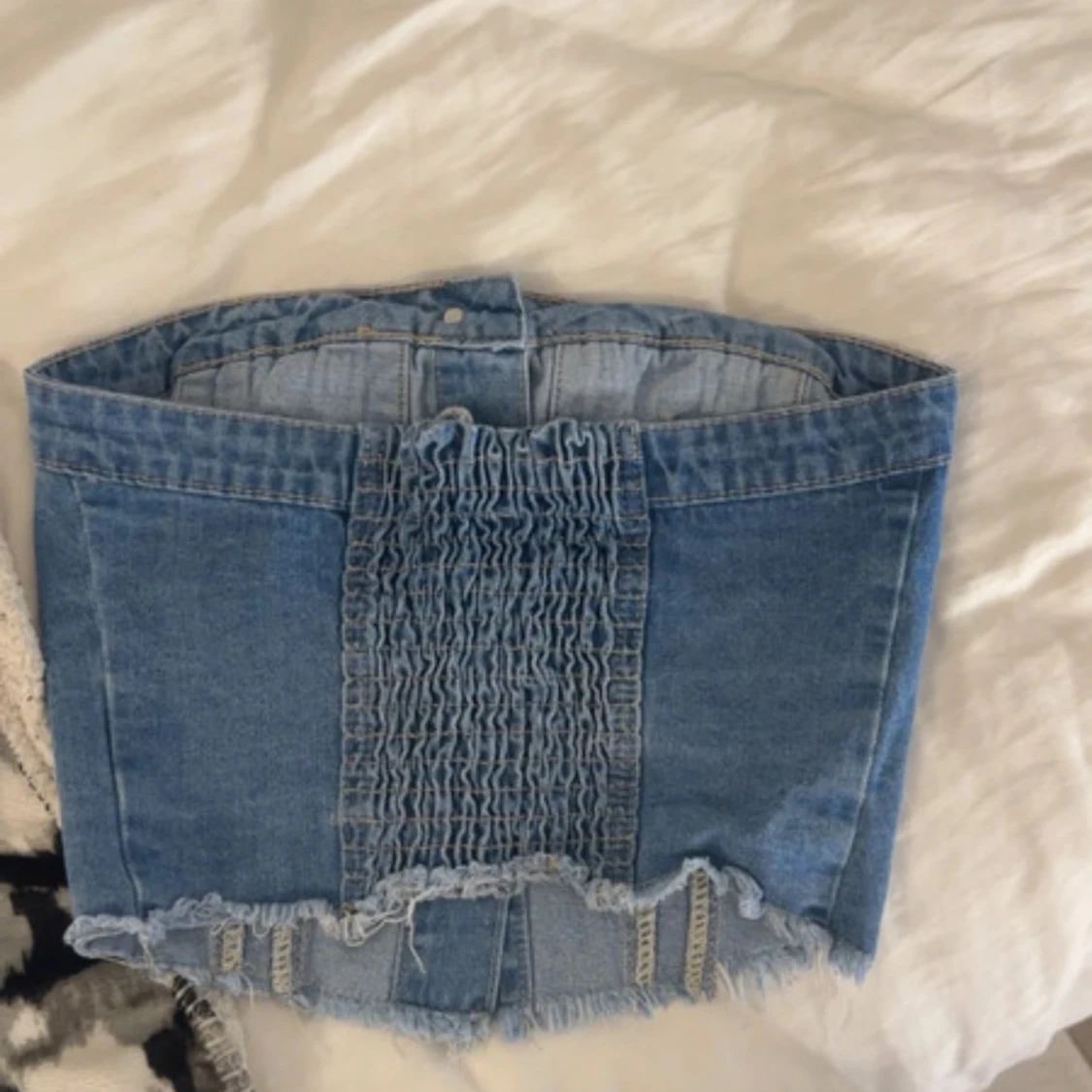 Säljer en snygg blå jeans tubtopp med knappar framtill och två dekorativa fickor. Toppen har fransad nederkant och smockad rygg för extra komfort.