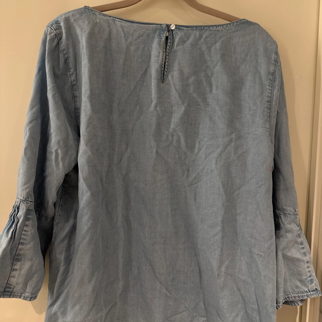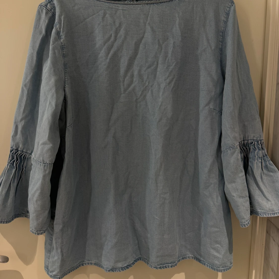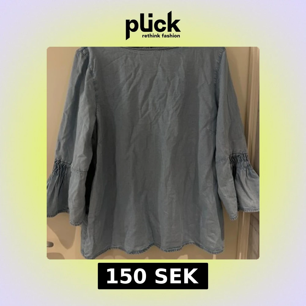 Säljer en ljusblå blus i jeansmaterial med snygga trumpetärmar och rynkade detaljer vid ärmsluten. Blusen har en enkel knapp i nacken och en rak, avslappnad passform.