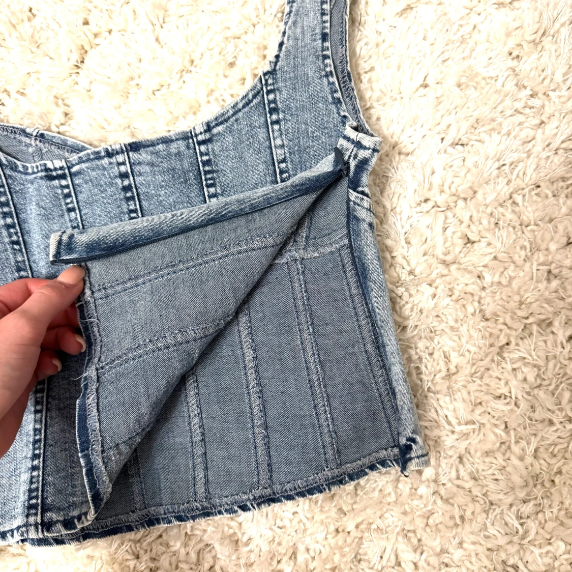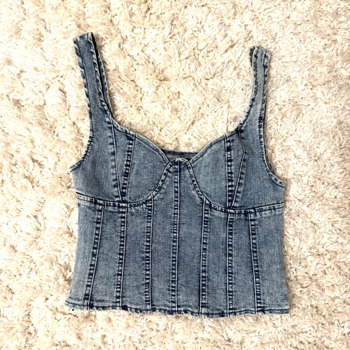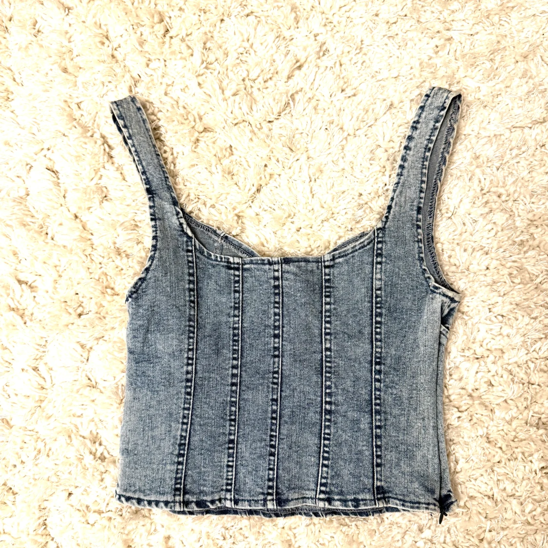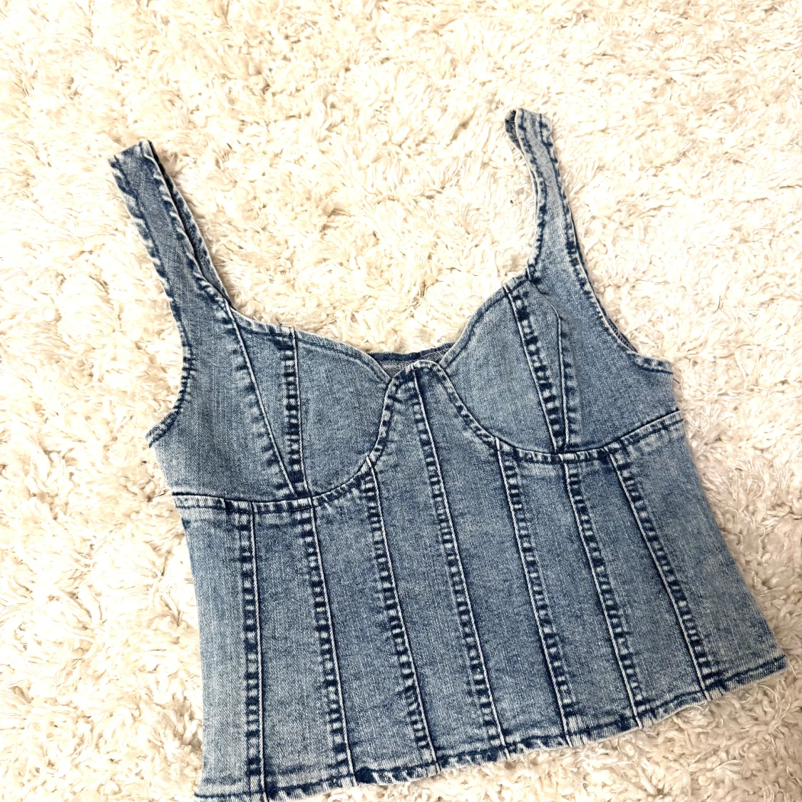 Säljer en snygg blå jeanskorsett topp med markerade sömmar och breda axelband. Toppen har en croppad passform och en cool denimlook som passar perfekt till både jeans och kjol. Perfekt för dig som vill ha en trendig och edgy stil.