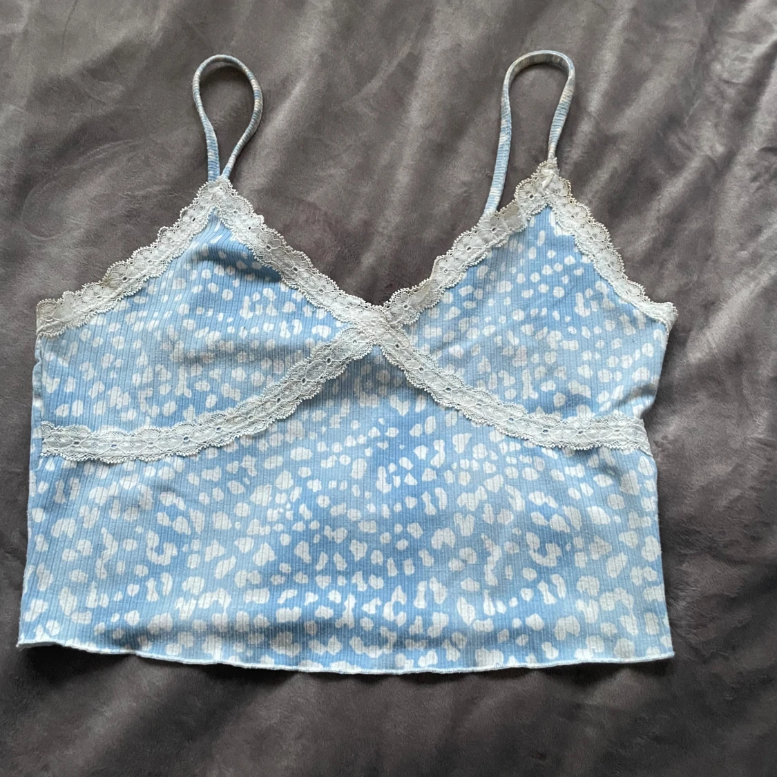 Blå leopardmönstrad linnetopp med spetsdetaljer