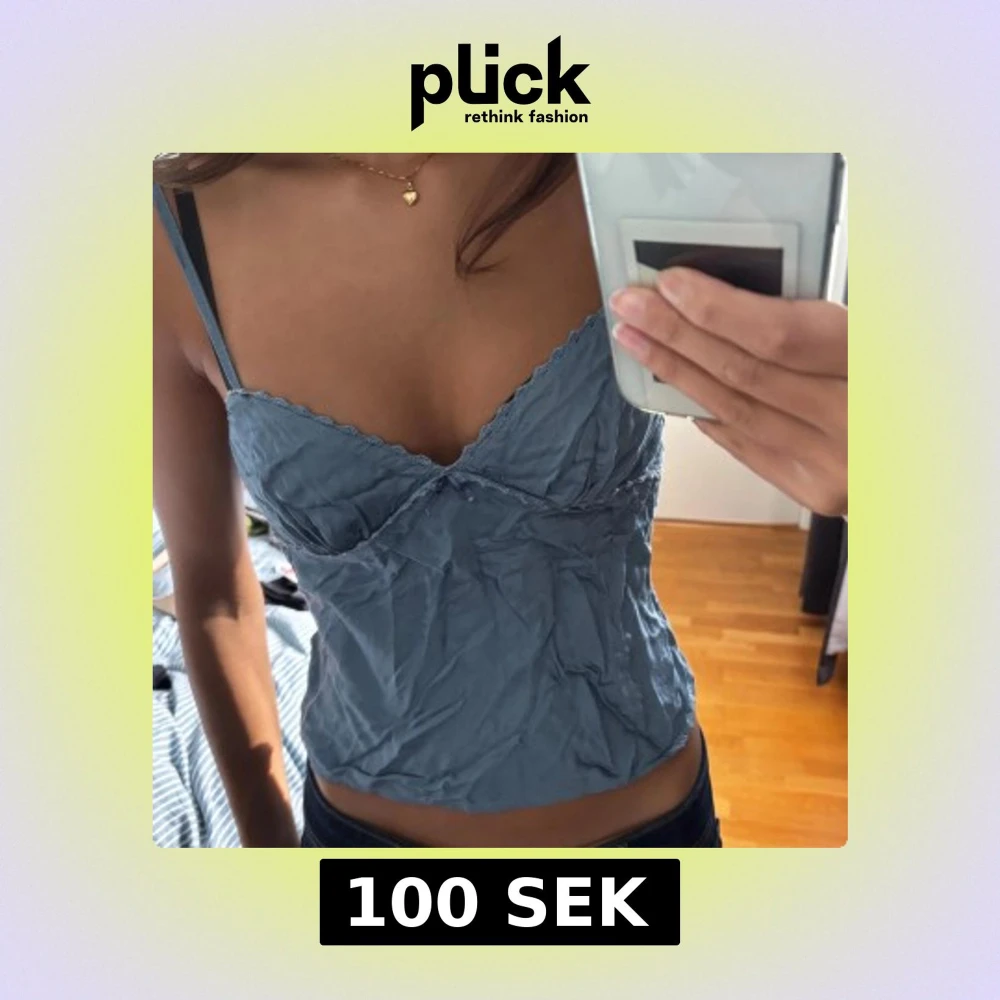 Säljer en blå linnetopp från Subdued med tunna axelband och liten rosett framtill. Toppen har spetsdetaljer längs kanterna och är figurnära med en lätt glansig finish. Perfekt för varma dagar eller att styla lager på lager.
