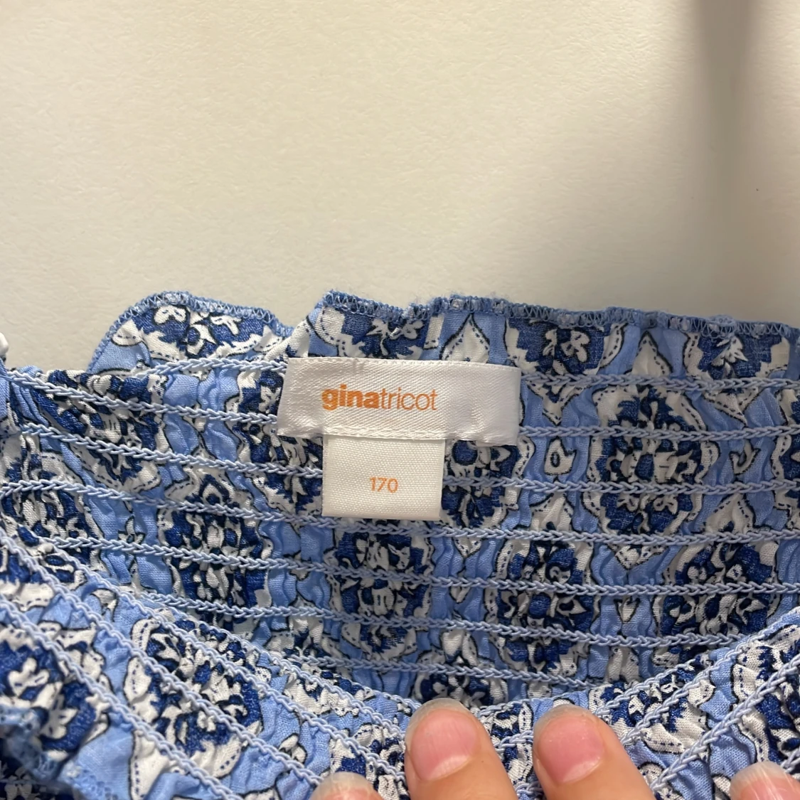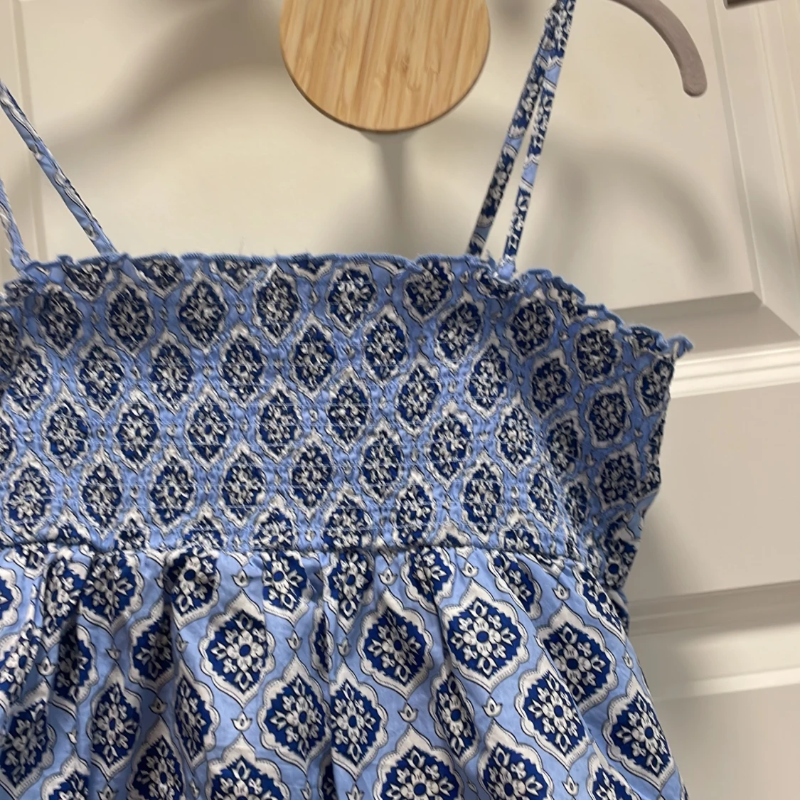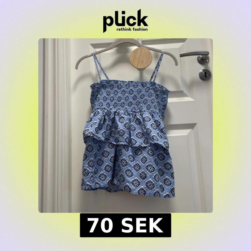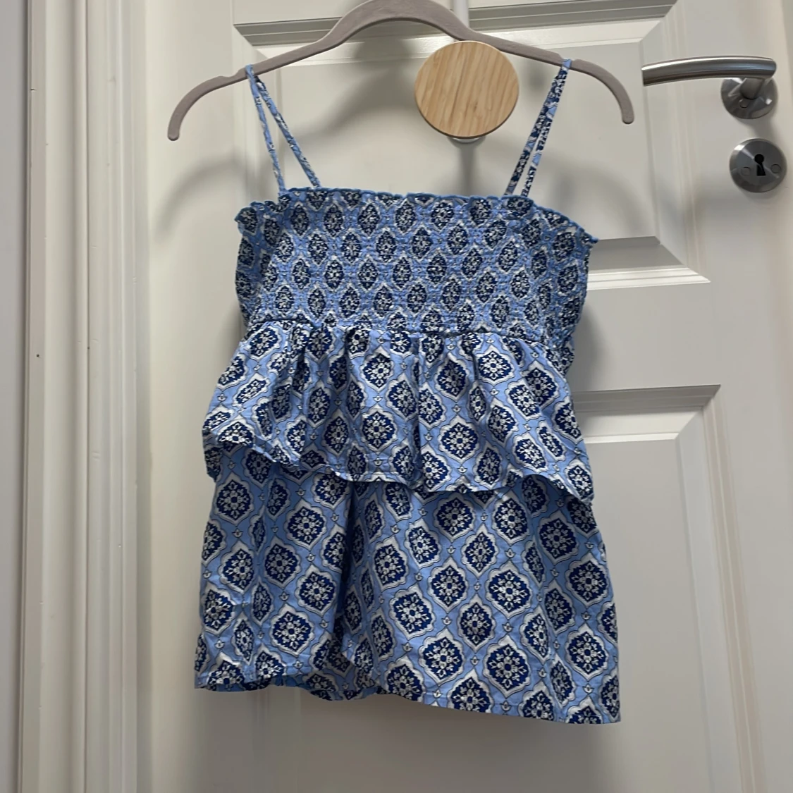 Supersöt blå och vit topp från Gina Tricot med smala axelband och volangdetalj. Toppen har ett snyggt mönster och smock upptill för en bekväm passform. Perfekt för varma dagar och somriga vibes!❤️storlek 170