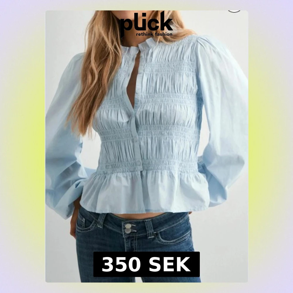 Säljer en ljusblå blus med smockad front och volang nedtill, då den inte kommit till någon användning. Blusen har långa puffärmar och knappar framtill. Den är tillverkad i ett lätt bomullsmaterial och har en feminin, fräsch look som passar perfekt till jeans.💓
