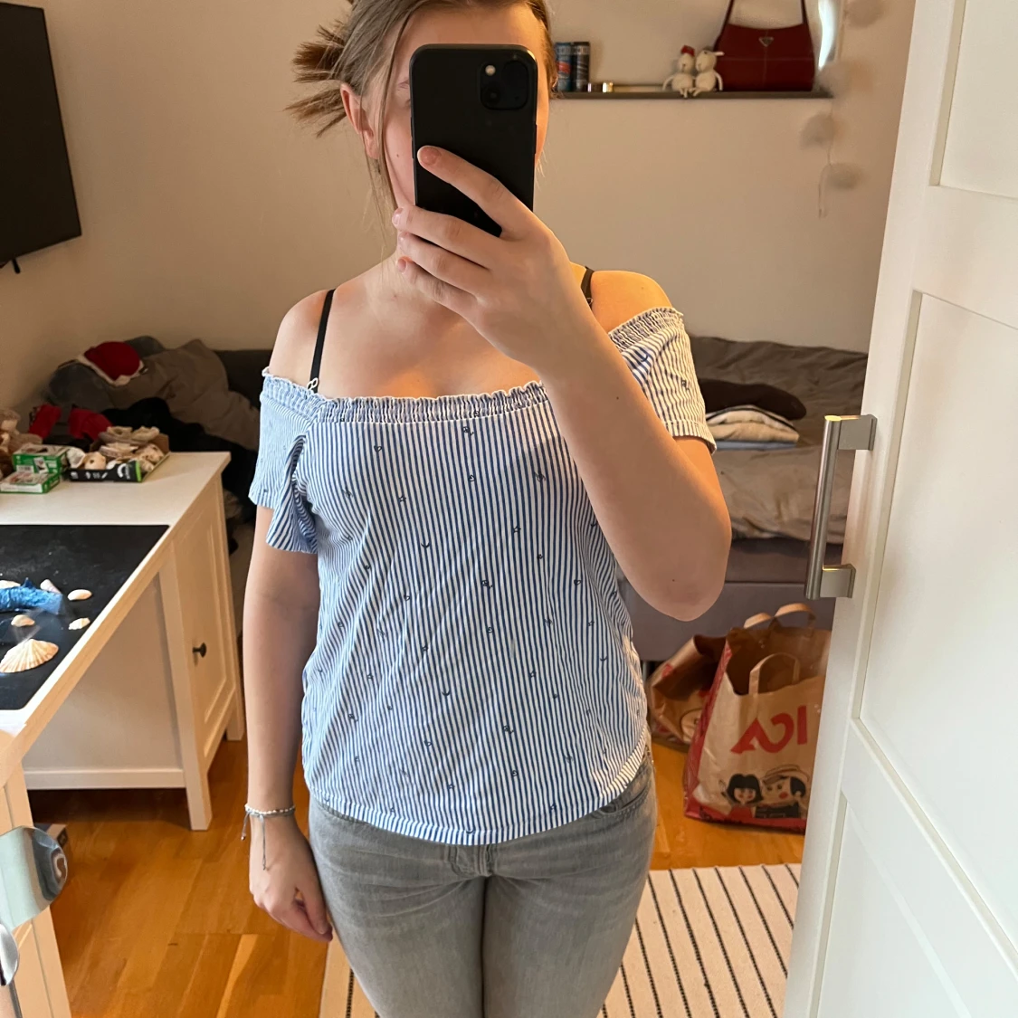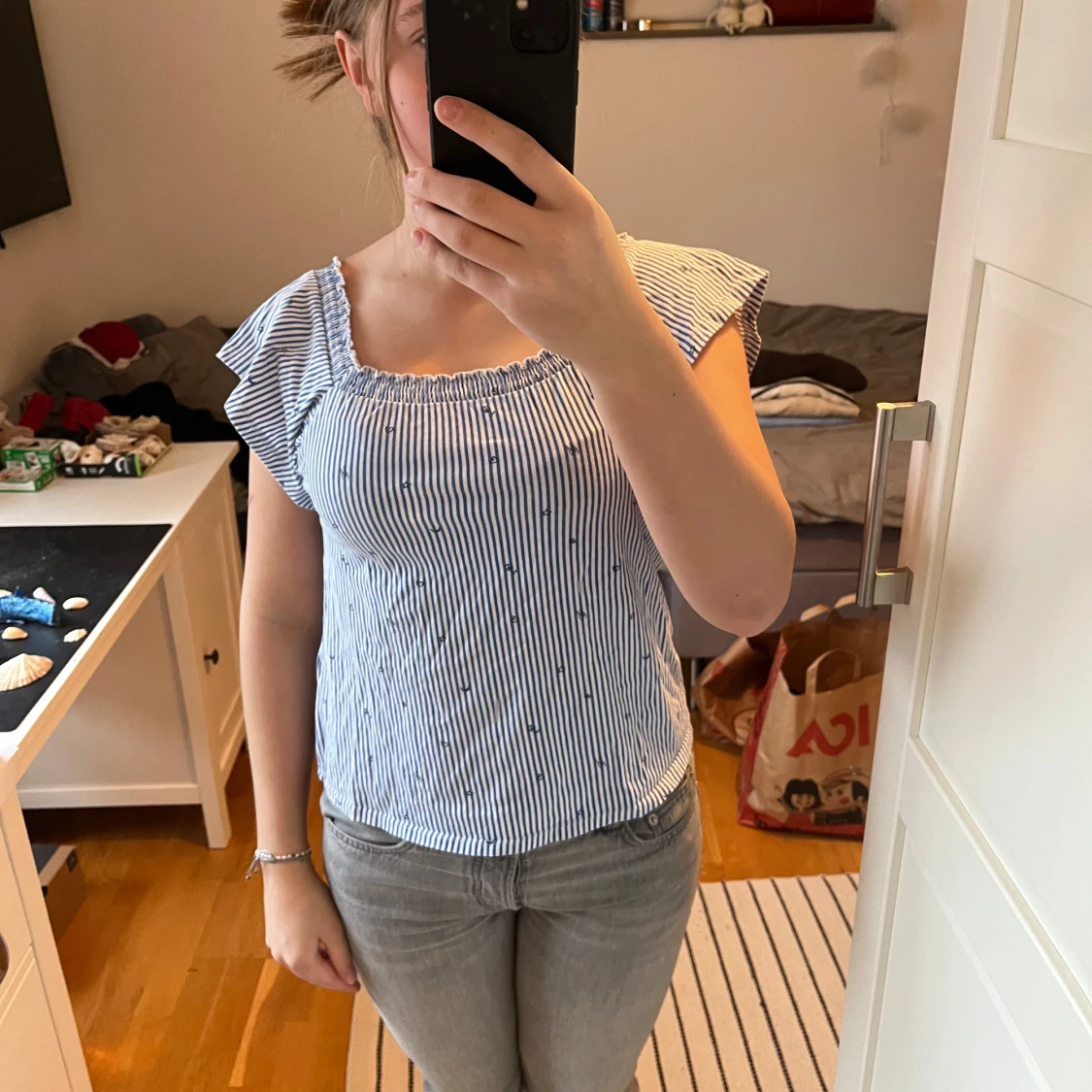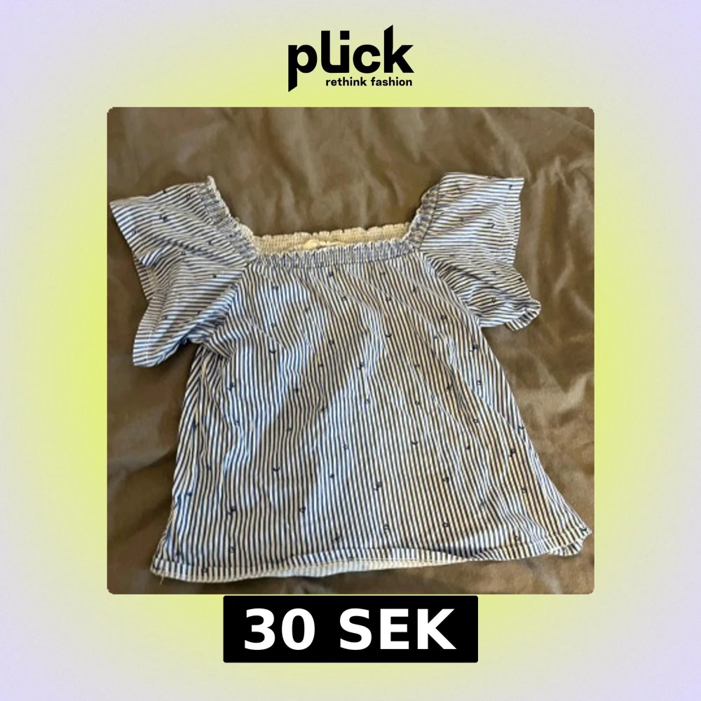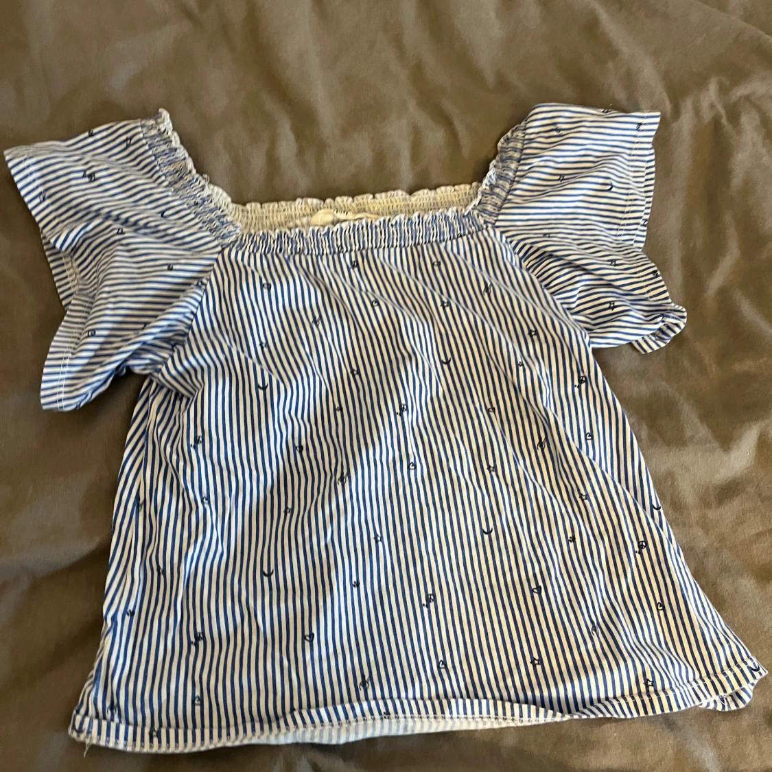 Säljer en söt blå- och vitrandig topp med korta ärmar och elastisk offshoulder-design. Toppen har små broderade detaljer och är perfekt för en avslappnad stil. Passar bra till jeans eller kjol.
