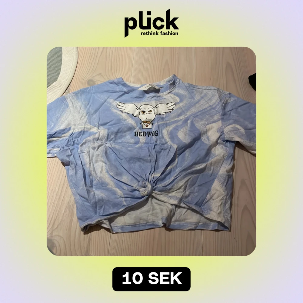 Säljer en cool blå och vit t-shirt från H&M med ett tryck av Hedwig från Harry Potter. T-shirten har en knut framtill för en trendig look. Perfekt för alla Potterheads! 💙