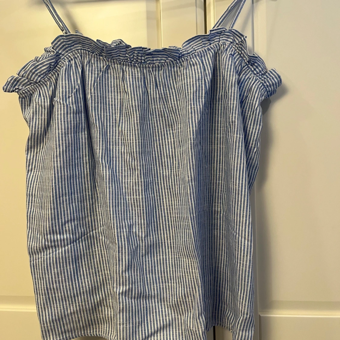 Säljer en söt blå- och vitrandig linnetopp med smala axelband och volangdetaljer vid halsringningen. Perfekt för varma sommardagar. Toppen har en luftig och bekväm passform.