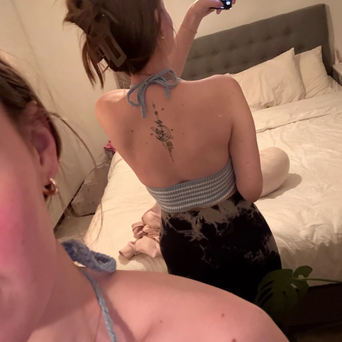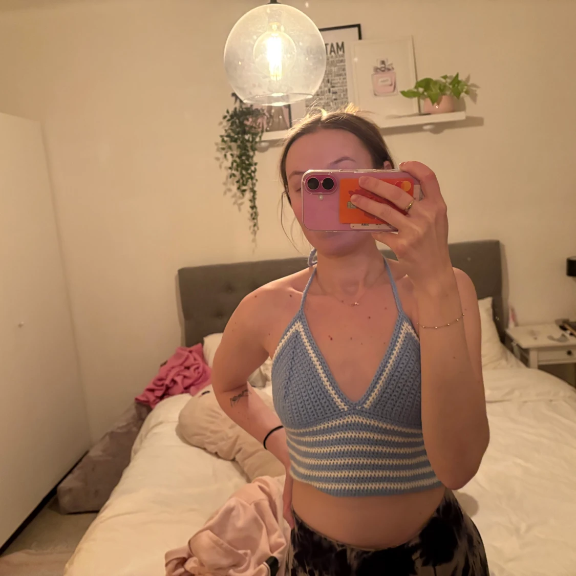 Säljer en söt blå- och vitrandig virkad halterneck-topp. Toppen är croppad och har en knytning i nacken. Perfekt för sommardagar! Egengjord och kan göra liknande toppar på beställning efter önskemål och färg