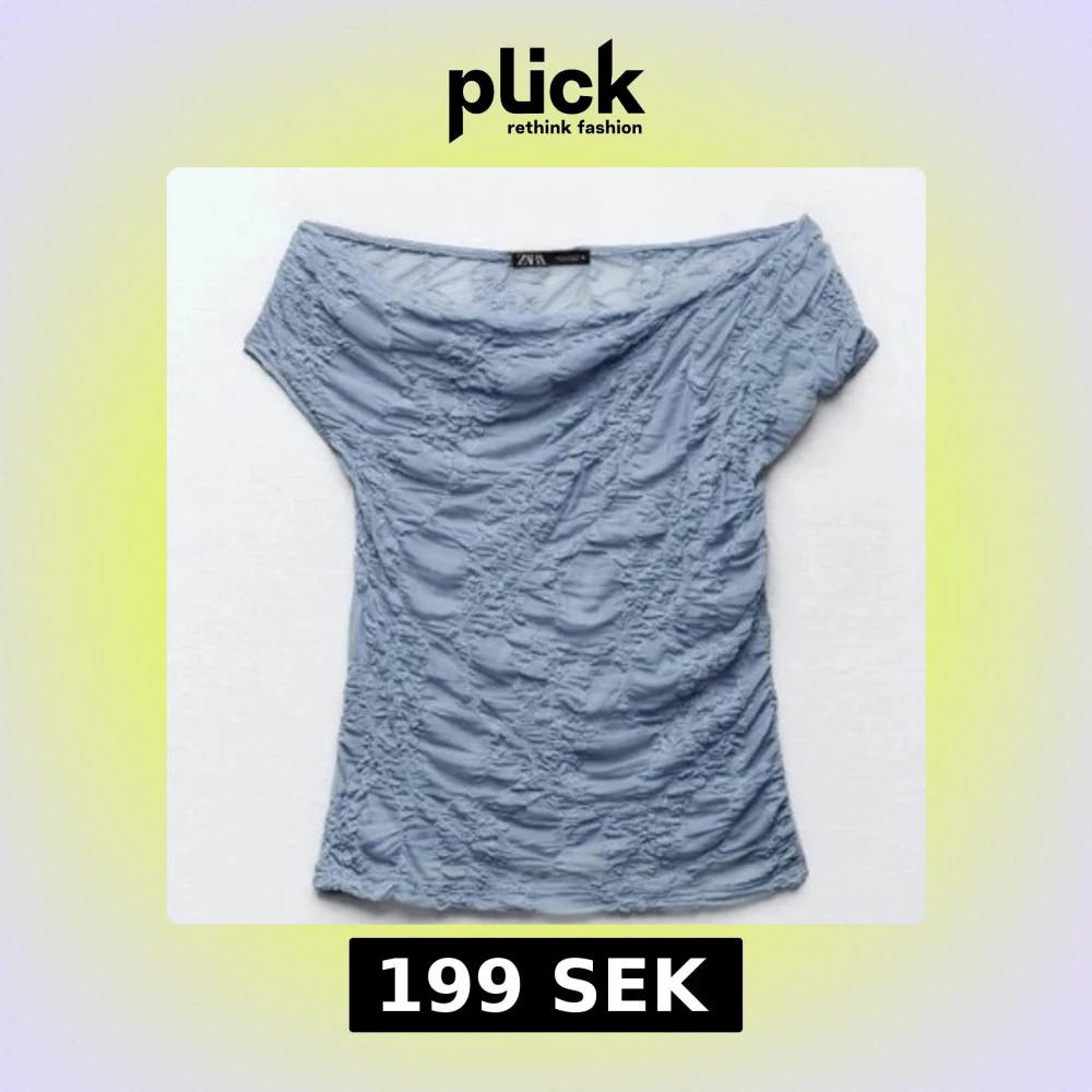 Snygg blå offshoulder topp från Zara med ett krinklat mönster. Perfekt för en stilren look med en touch av elegans. Toppen har en lös passform och är tillverkad i ett lätt material.