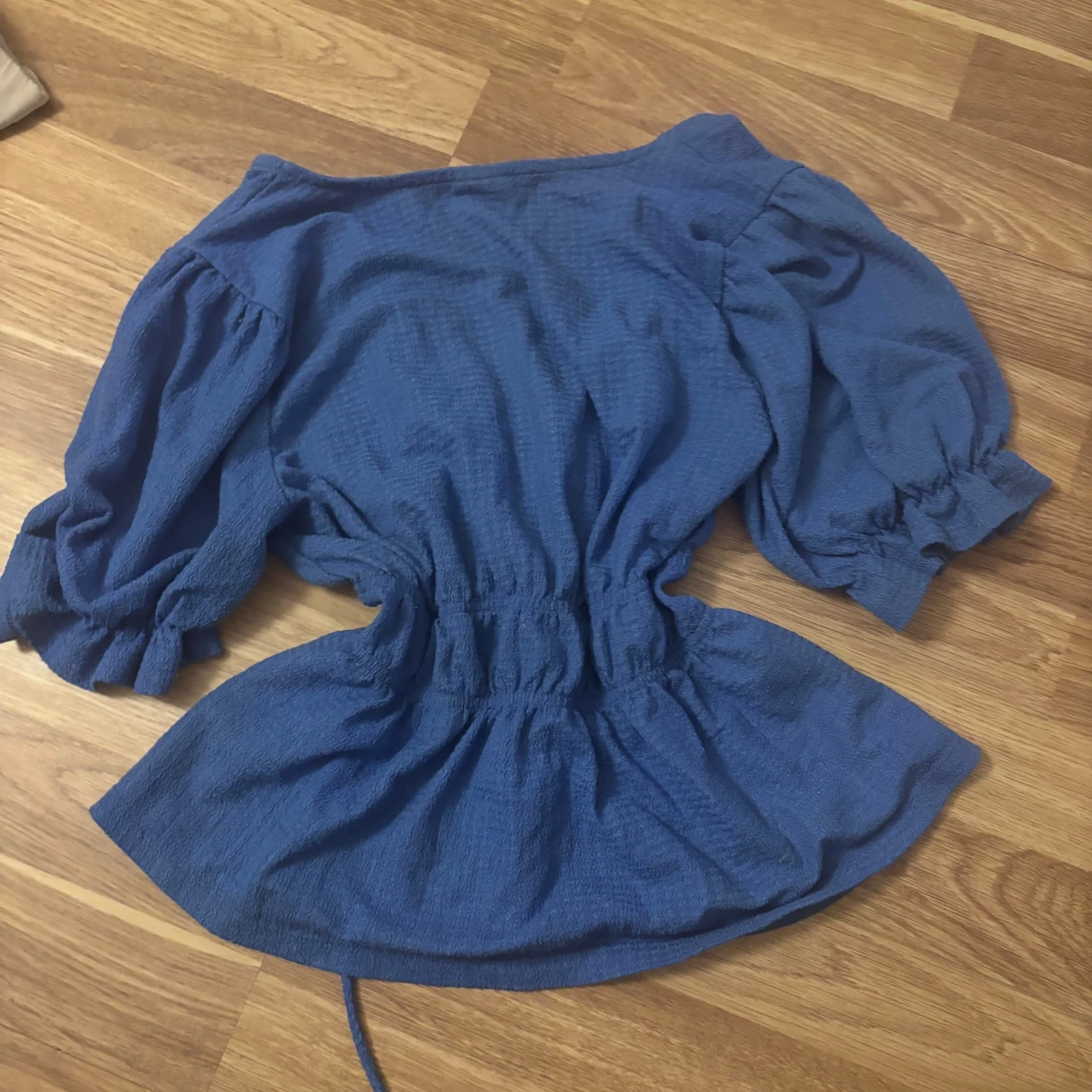 Säljer en blå omlottblus från Gina Tricot i storlek S. Blusen har puffiga trekvartsärmar, knytband i midjan och v-ringning. Materialet är lätt och har en strukturerad känsla. Perfekt för dig som gillar en feminin och trendig look.