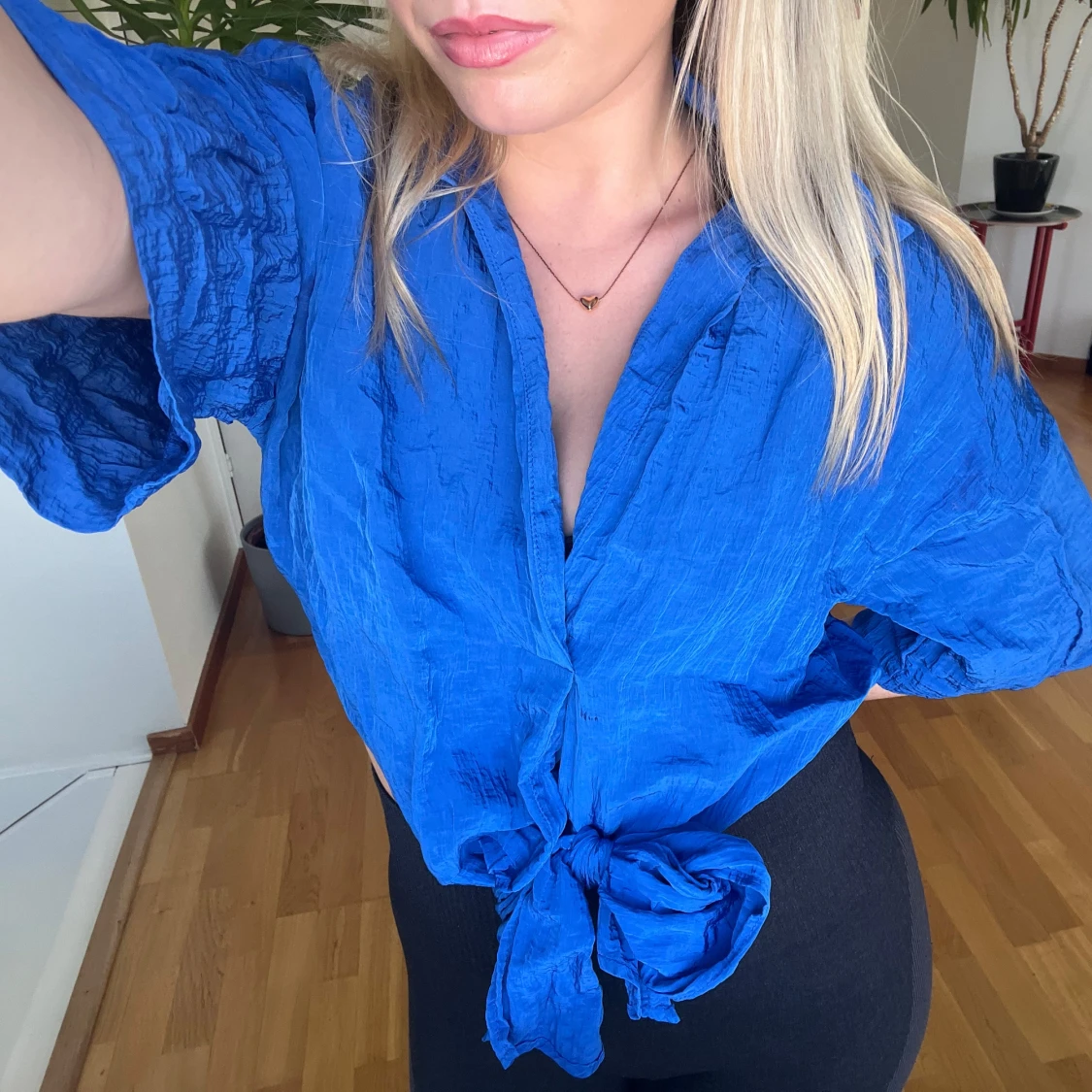 Säljer en blå omlottblus med korta, vida ärmar och knyt framtill. Blusen har en djup v-ringning och är tillverkad i ett lätt, skrynkligt tyg som ger en avslappnad känsla. Perfekt för dig som vill ha en färgstark och trendig topp.