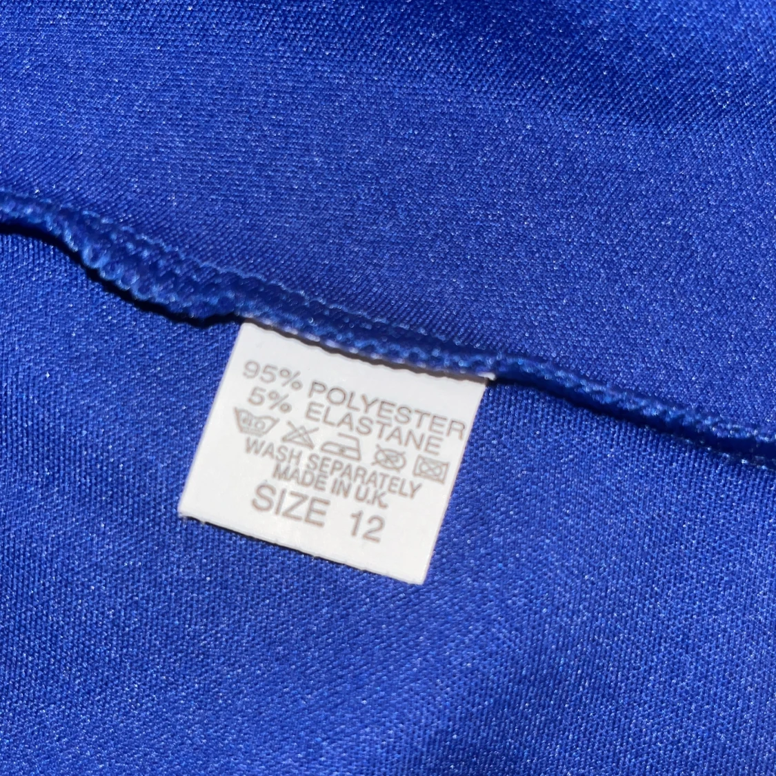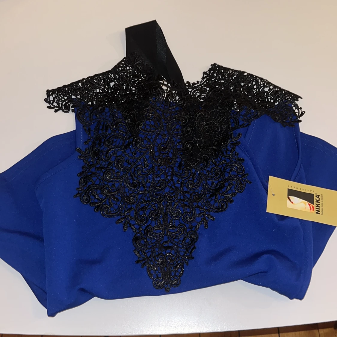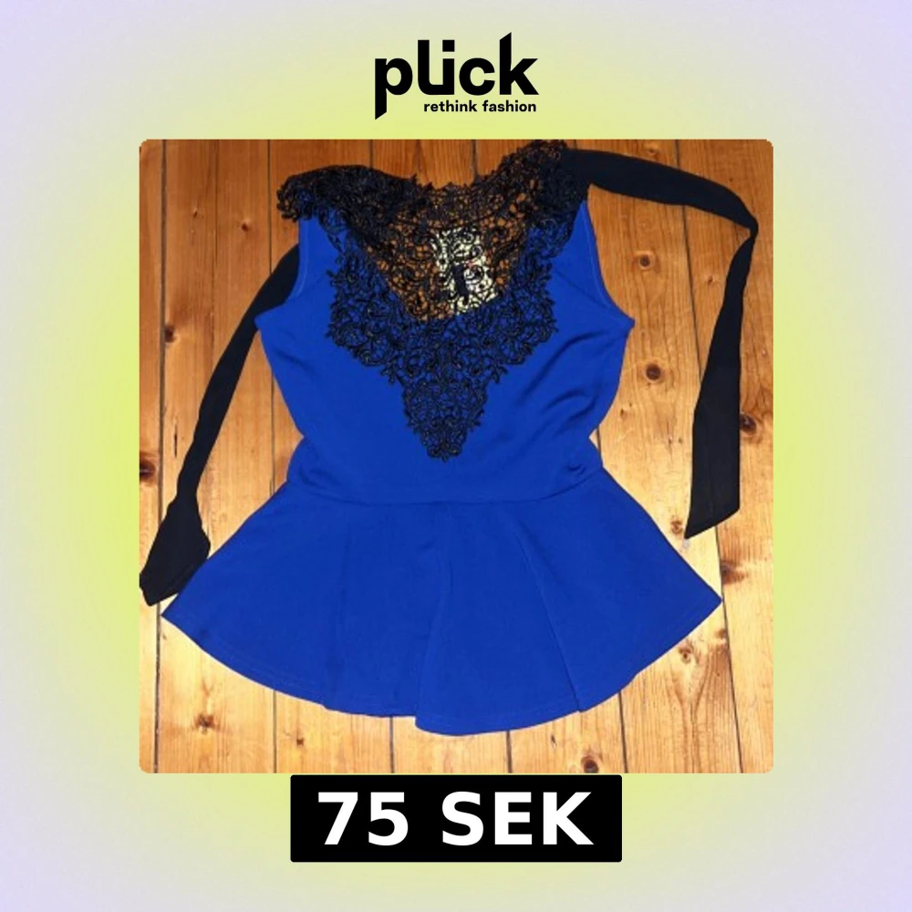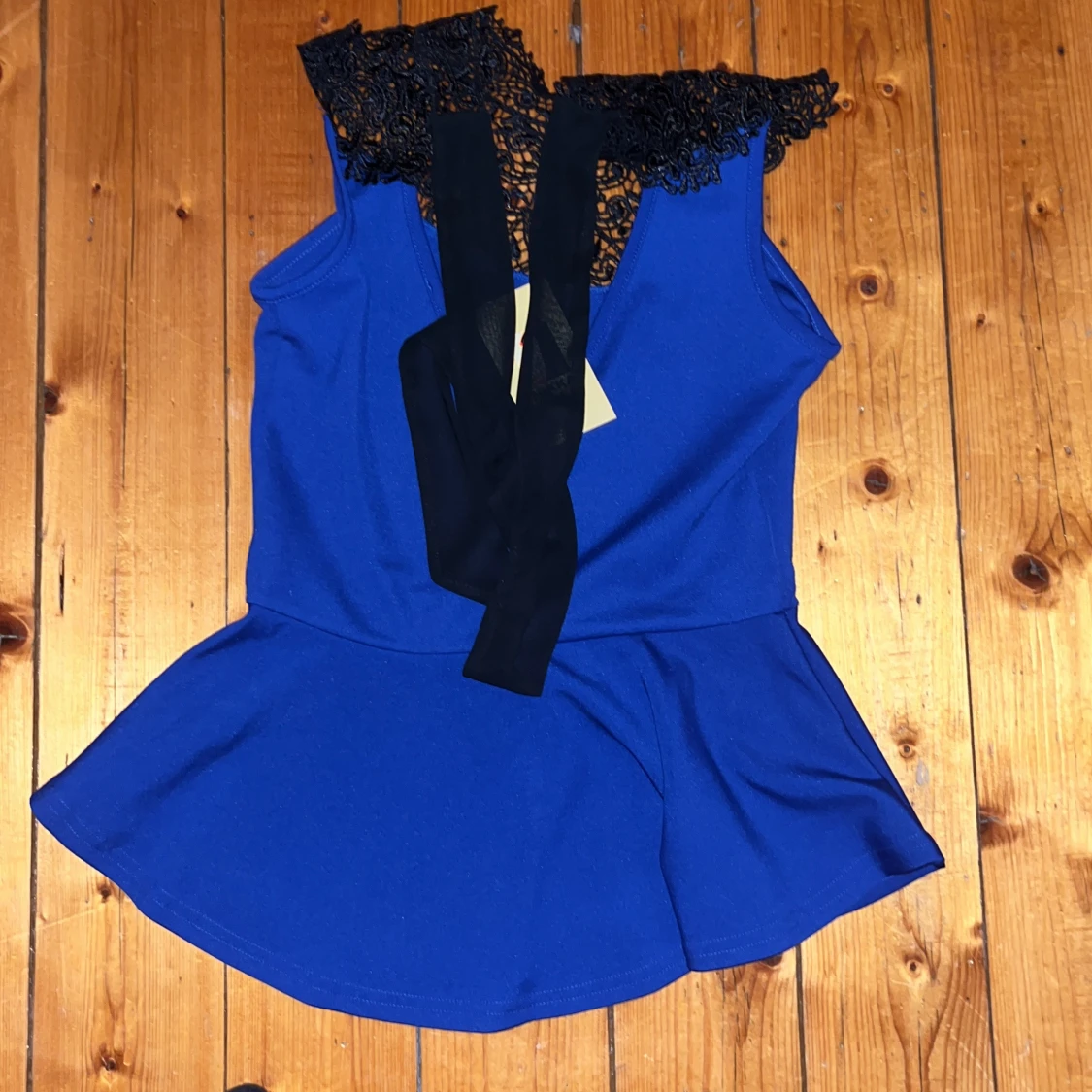 Säljer en snygg blå peplum blus från Nikka med svart spetsdetalj i halsen och breda svarta band att knyta i nacken. Blusen är ärmlös och har en feminin siluett med volang nedtill. Materialet är mjuk polyester med lite stretch för skön passform.