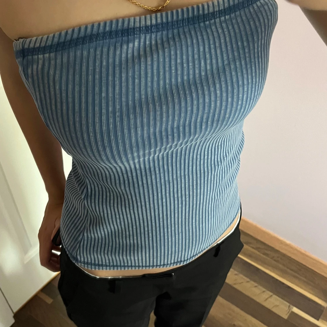 Säljer en blå ribbad bandeau tubtopp med smala vita ränder. Toppen är tight och ärmlös, perfekt för varma dagar. Materialet känns mjukt och stretchigt, vilket gör den superbekväm att bära. Enkel och stilren design som passar till mycket.