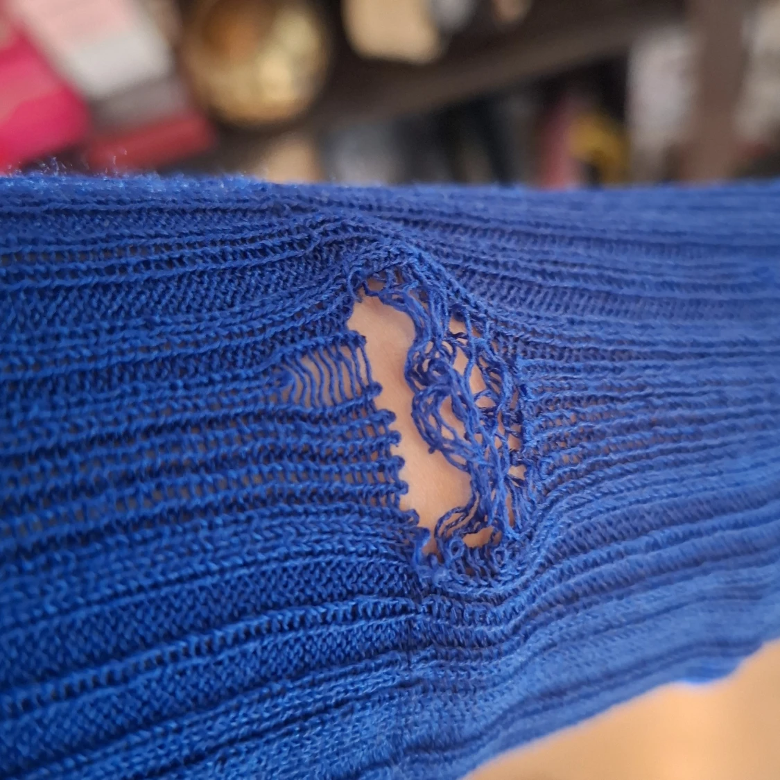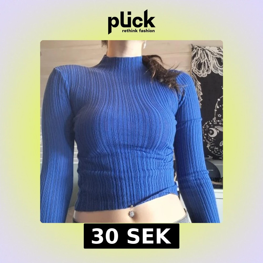 Säljer en blå ribbad långärmad tröja med tight passform och hög hals. Tröjan är croppad och har ett stretchigt material som sitter snyggt på kroppen. Är i storlek S. Perfekt för dig som gillar en enkel men stilren look. Har ett litet hål på vänster arm tyvärr.