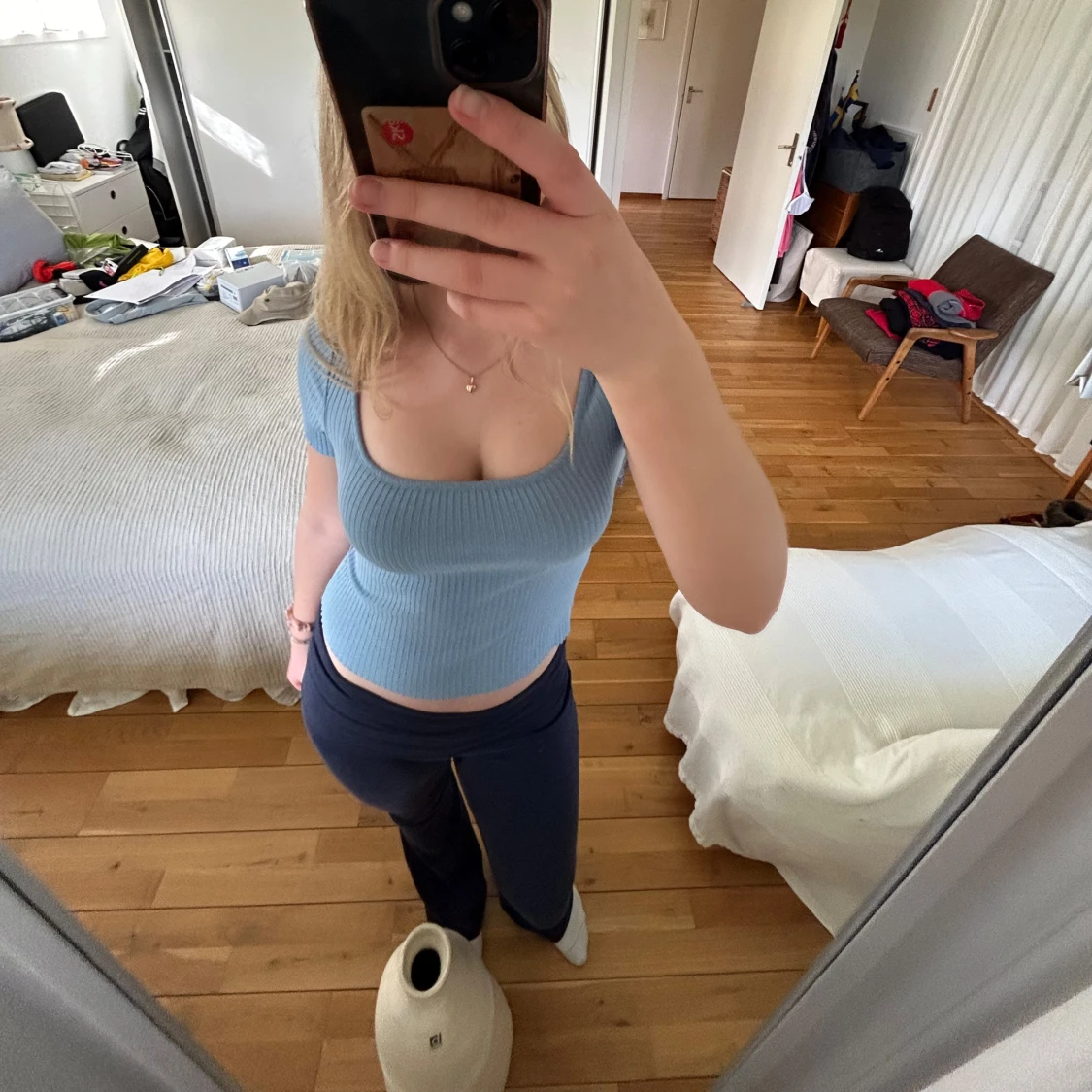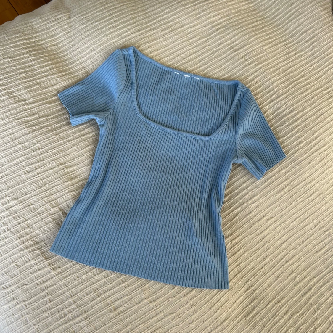 Blå ribbad topp med korta ärmar, skulle anta att det är storlek S då lappen är borta 💋