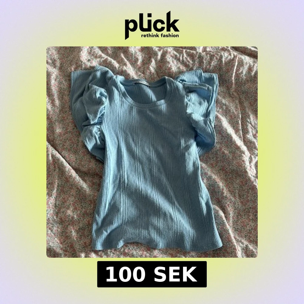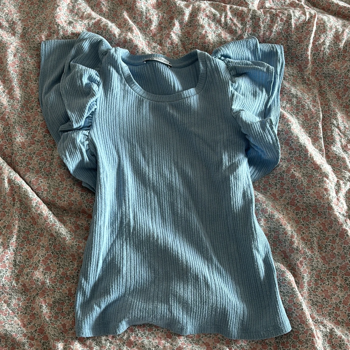 Supersöt ljusblå topp med ribbad struktur och stora volangärmar som ger en extra touch.