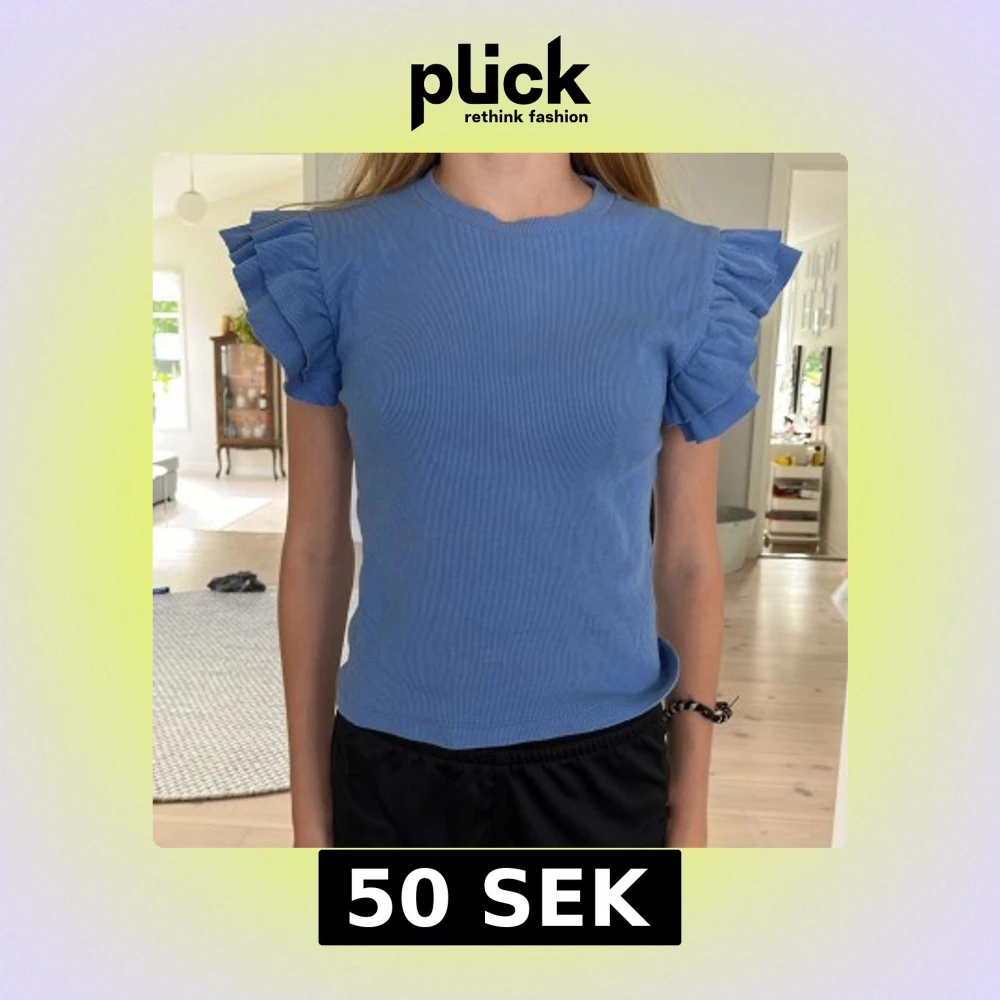Supersnygg blå topp med ribbad struktur och korta ärmar med dubbla volanger som ger en cool och unik look. Rund halsringning och figurnära passform. Perfekt för dig som vill sticka ut med detaljer och älskar färg.