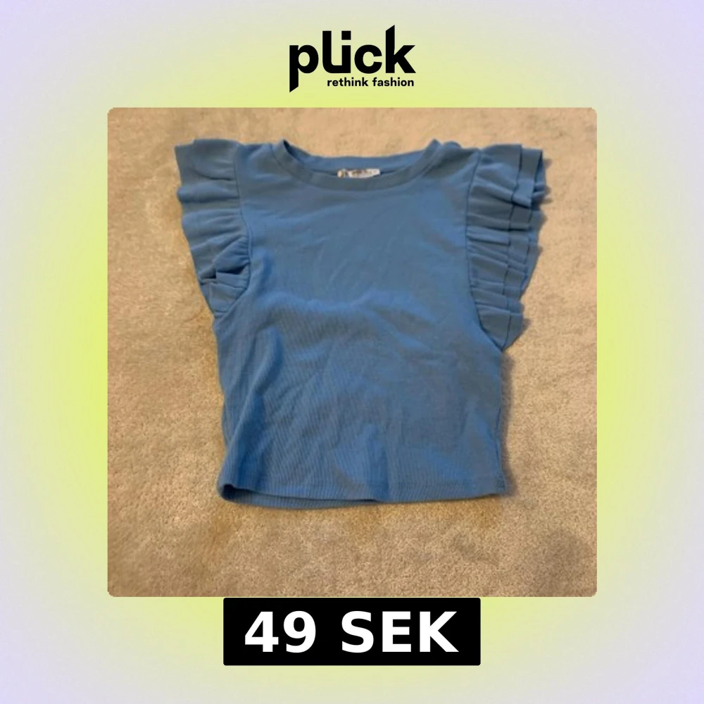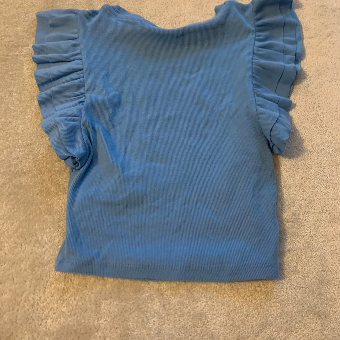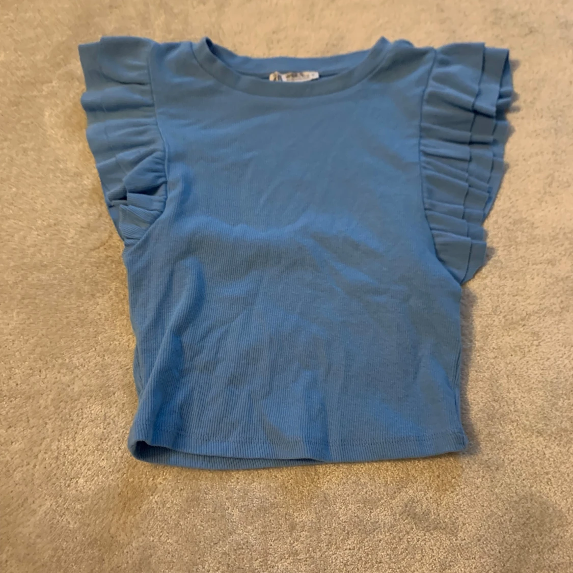 Säljer en söt blå ribbad topp med volangdetaljer på ärmarna. Perfekt för en somrig look! 💙
