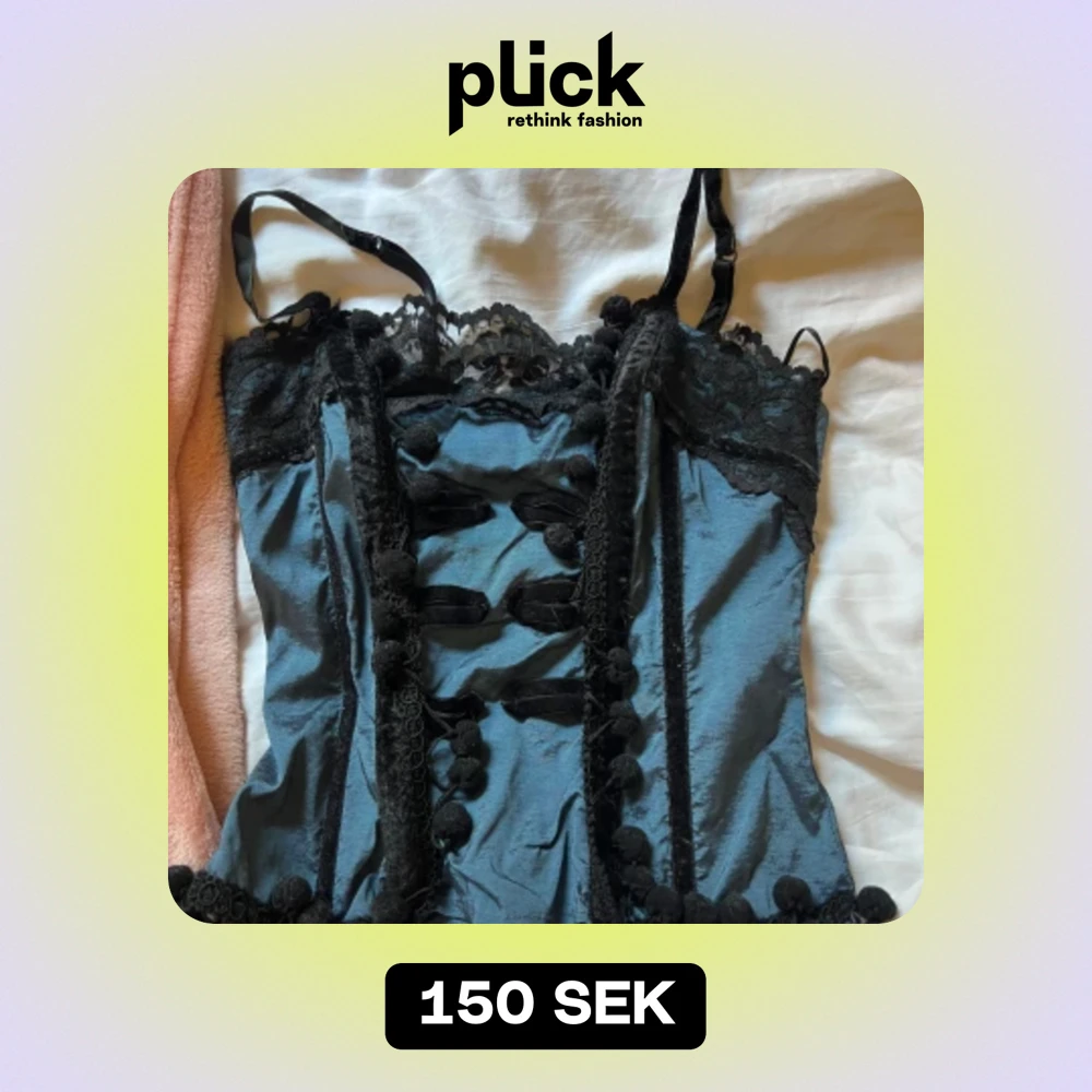 Säljer en snygg korsett i svart och blått med fina spetsdetaljer. Den har justerbara axelband och en vacker spetskant upptill. Framsidan är dekorerad med knappar och spetsband som ger en elegant look. Perfekt för fest eller speciella tillfällen!