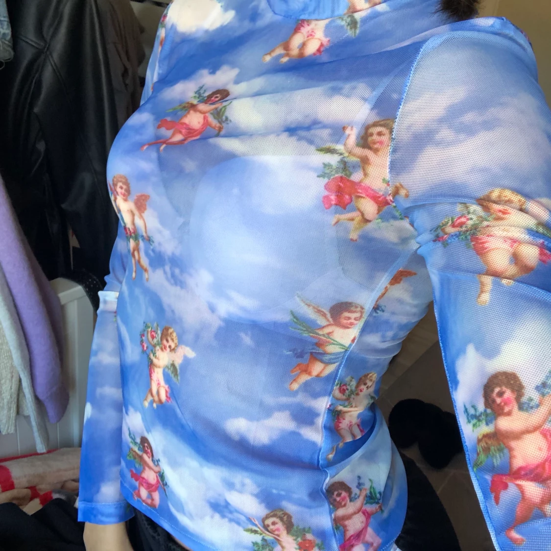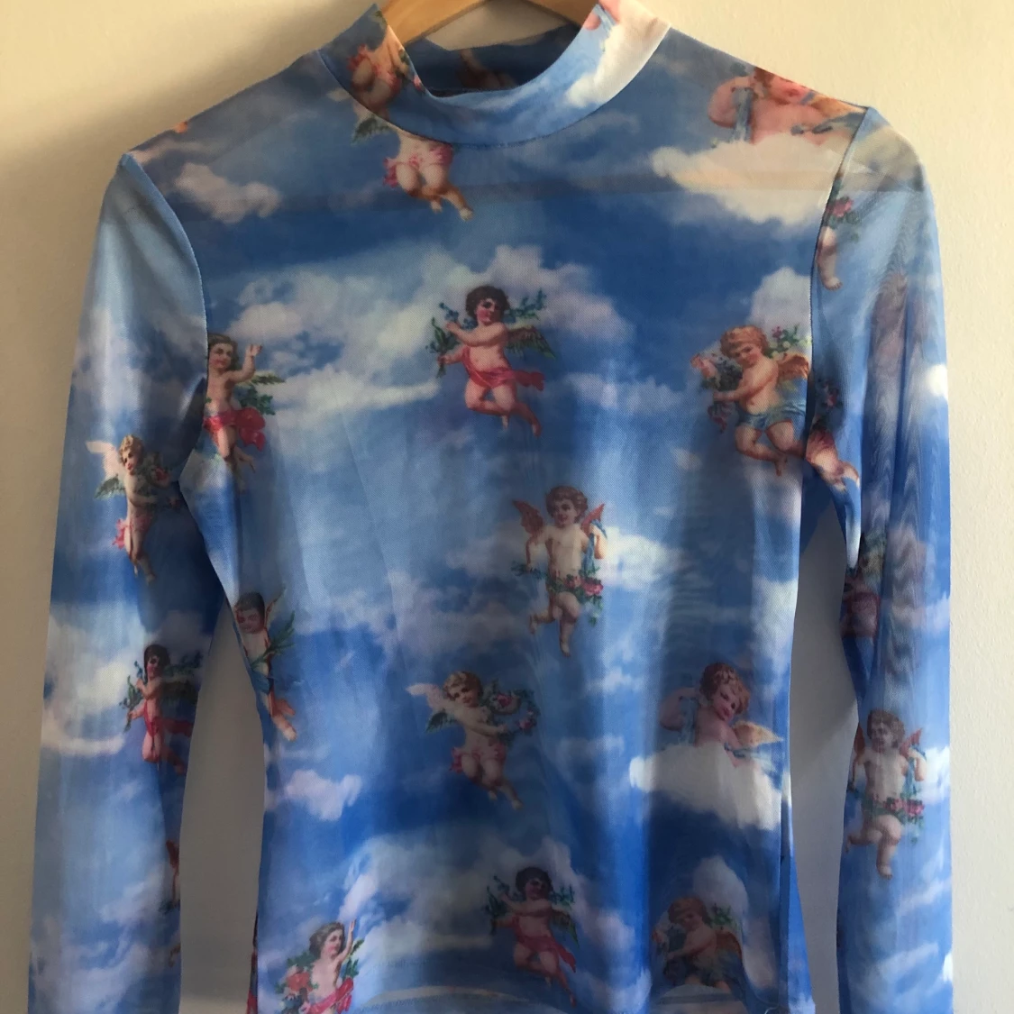 Söt see through top med angel-print 👼🏽 Köpte för 100 kr från shein. Den är ganska varm för att vara see through då materialet är i polyester (som tar upp mycket värme). Har använt ca 2 gg 🤍 Kan mötas i stockholm.