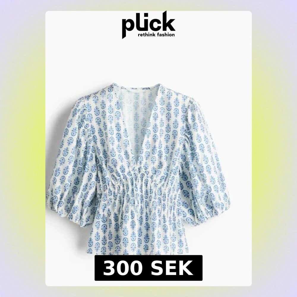 Söt blus med blått blommönster på vit botten. Djup v-ringning, puffiga trekvartsärmar och smockad midja ger en trendig siluett.